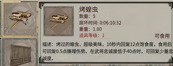 攢滿四只蝗蟲,你就能在篝火里做出一串香噴噴嘎嘣脆的蝗蟲美餐,食用一份能在10秒內恢復12飽食度。