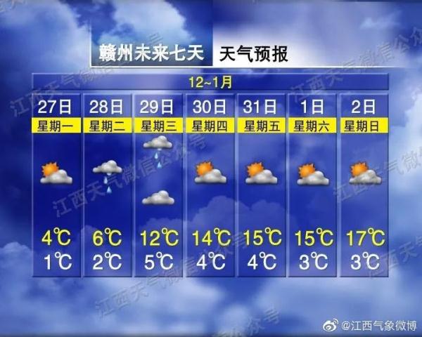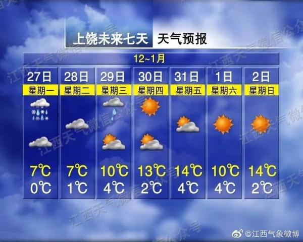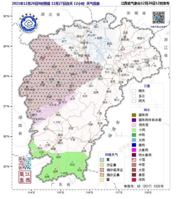 早晨贛北北部局部山區有霧。明天白天萍鄉、新余兩市和宜春市南部、吉安市北部小雪轉陰天;贛州市陰天,局部地區有小雨;全省其他地區陰天,局部地區有短時雨夾雪或小雪。明天晚上贛州市和吉安、撫州兩市南部陰天有小雨;全省其他地區以陰天多云為主。