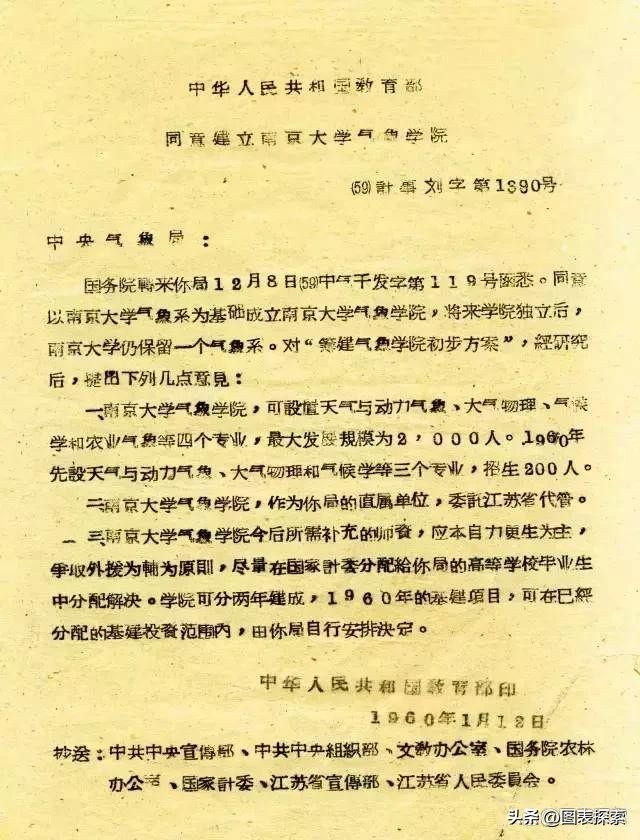 第2個原因就是南京信息工程大學誕生的方式和別的學校不一樣。雖然當時的南京大學氣象學院,在1960年成立時是南京大學的二級學院,實際上是中央氣象局的直屬高校,相當于代孕。這批學生入校,雖然是以南京大學招進來的,但是入學時已經明確告知,短時間內會獨立建校,不過暫時和南京大學氣象系的學生合班上課。