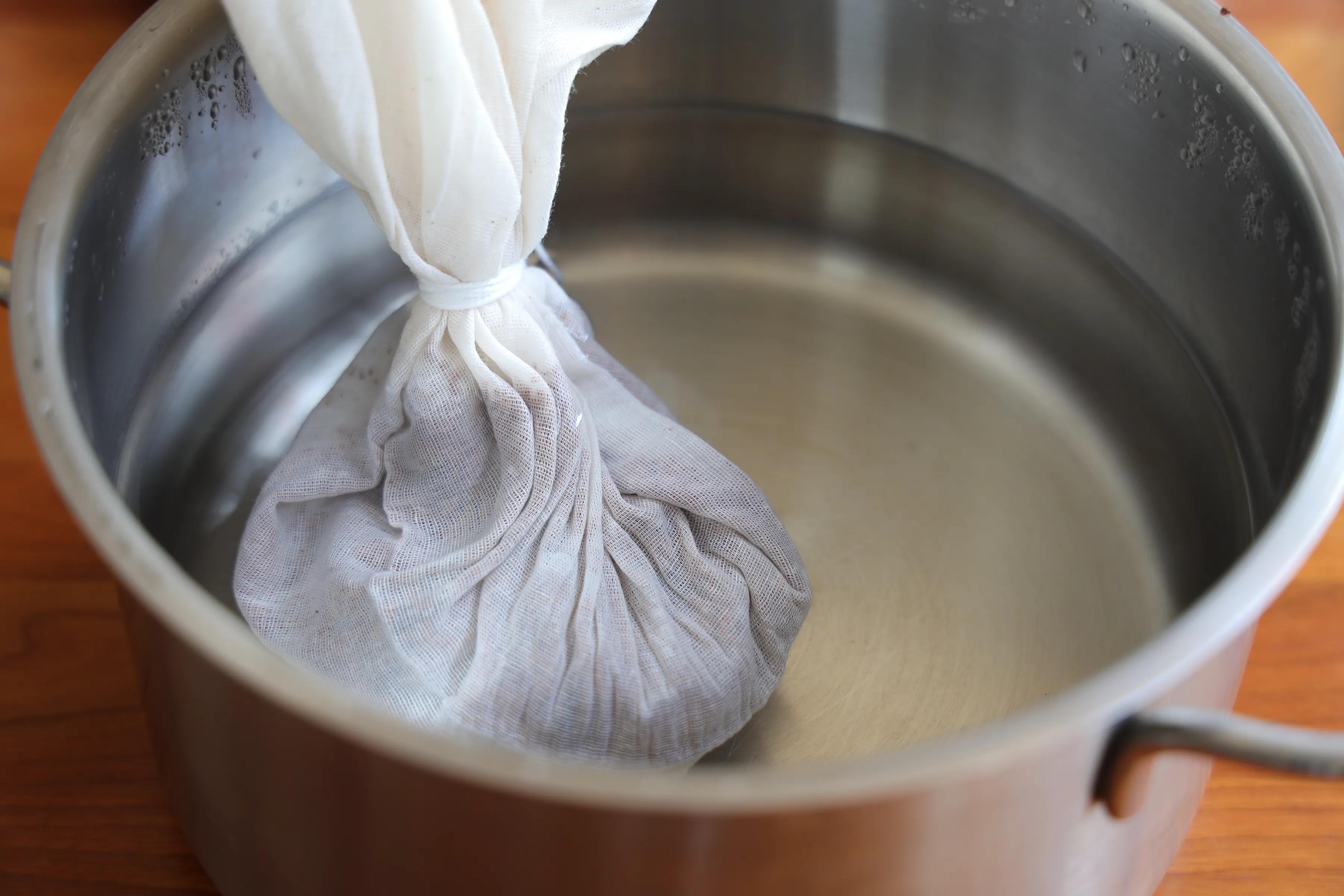 3、50克冰粉籽放在紗布里,用繩子綁緊,先放在小碗涼開水里清洗下,再放在1500ML的涼開水或是純凈水里,浸泡3-5分鐘再開始搓冰粉;