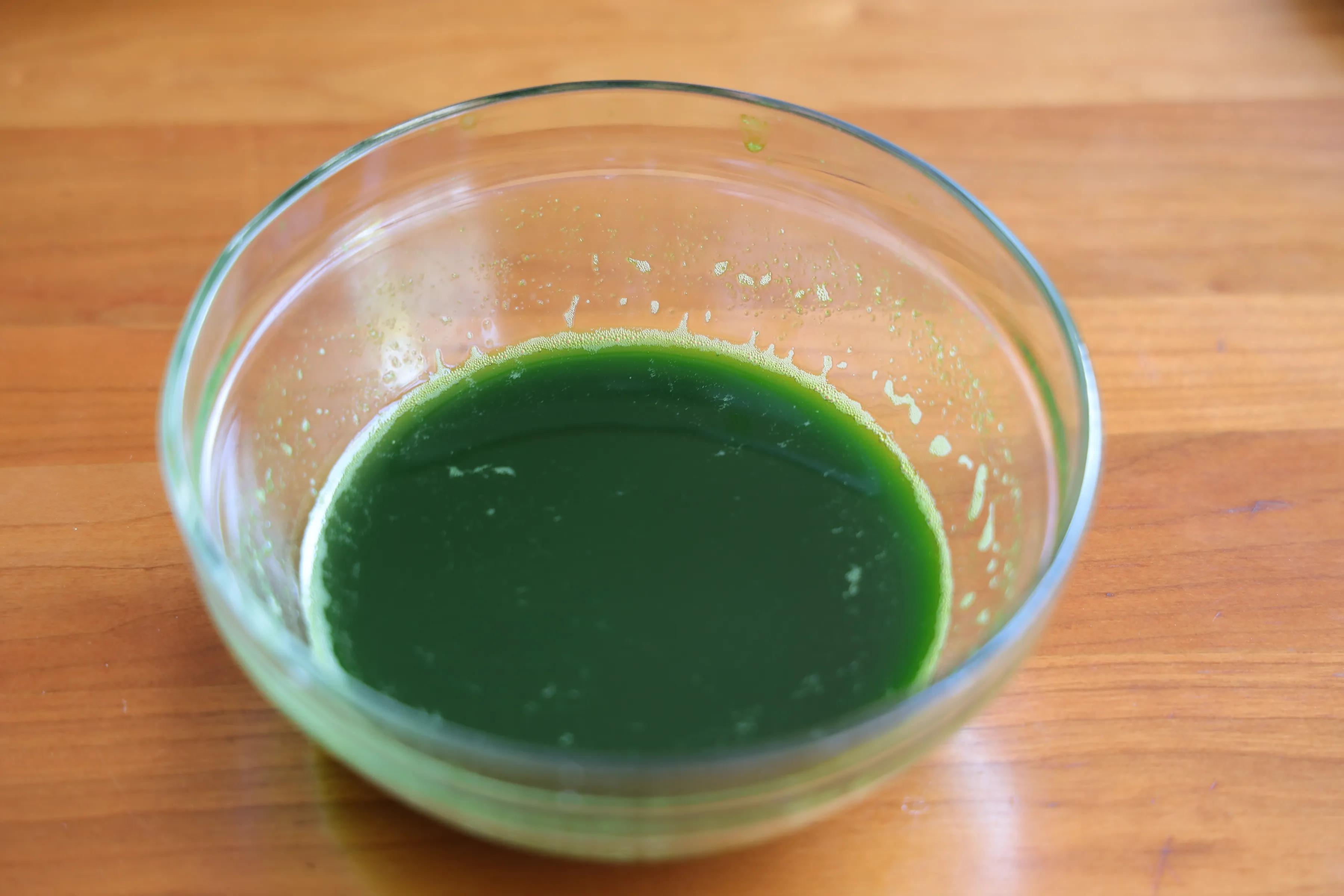 5、想要顏色的在這一步可以加入黃瓜汁或者其他顏色的汁水。攪拌均勻,然后分次少量的加入石灰水,快速的攪拌均勻,這一步一定要快速攪勻,直到攪拌起來有明顯的阻力就可以了;