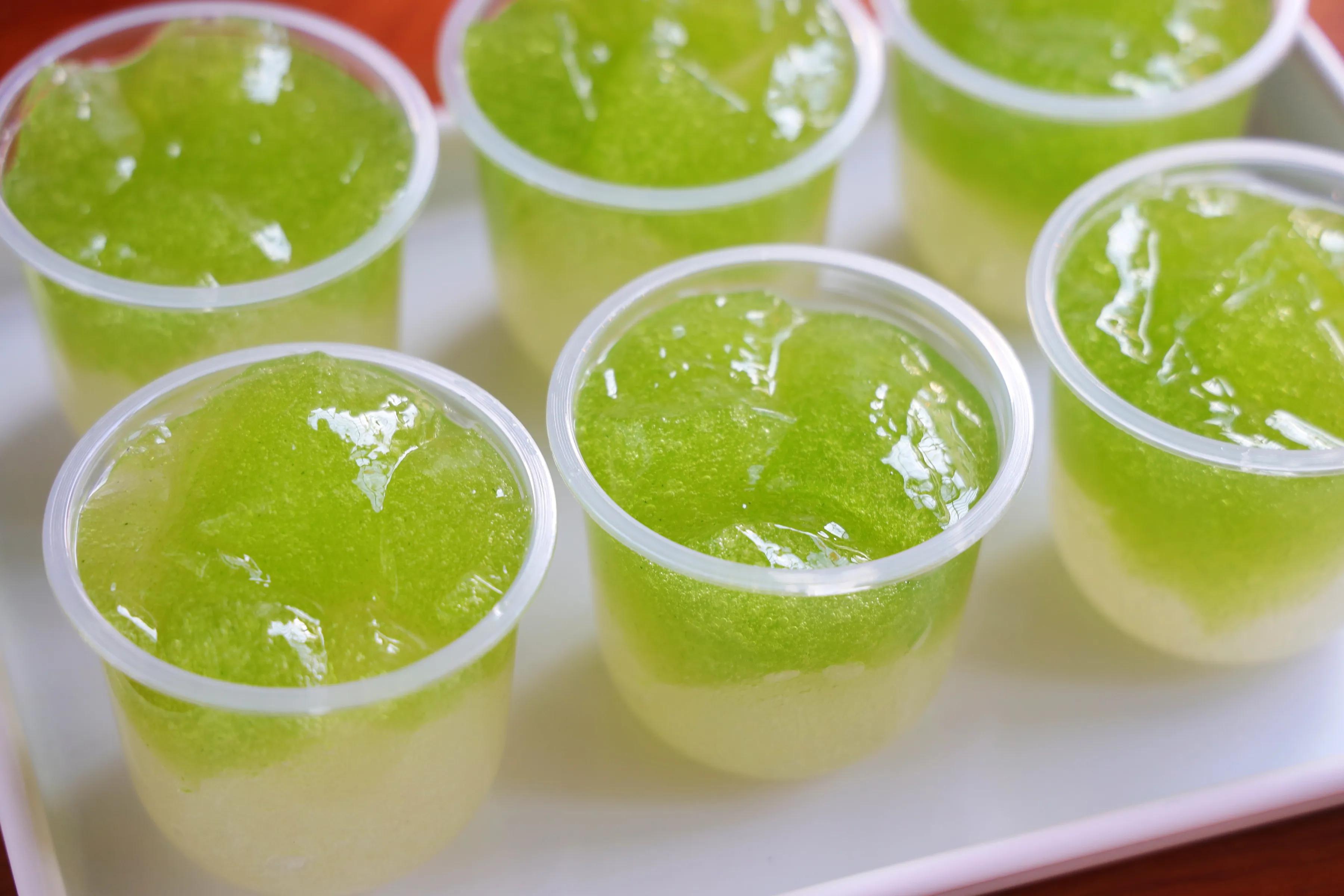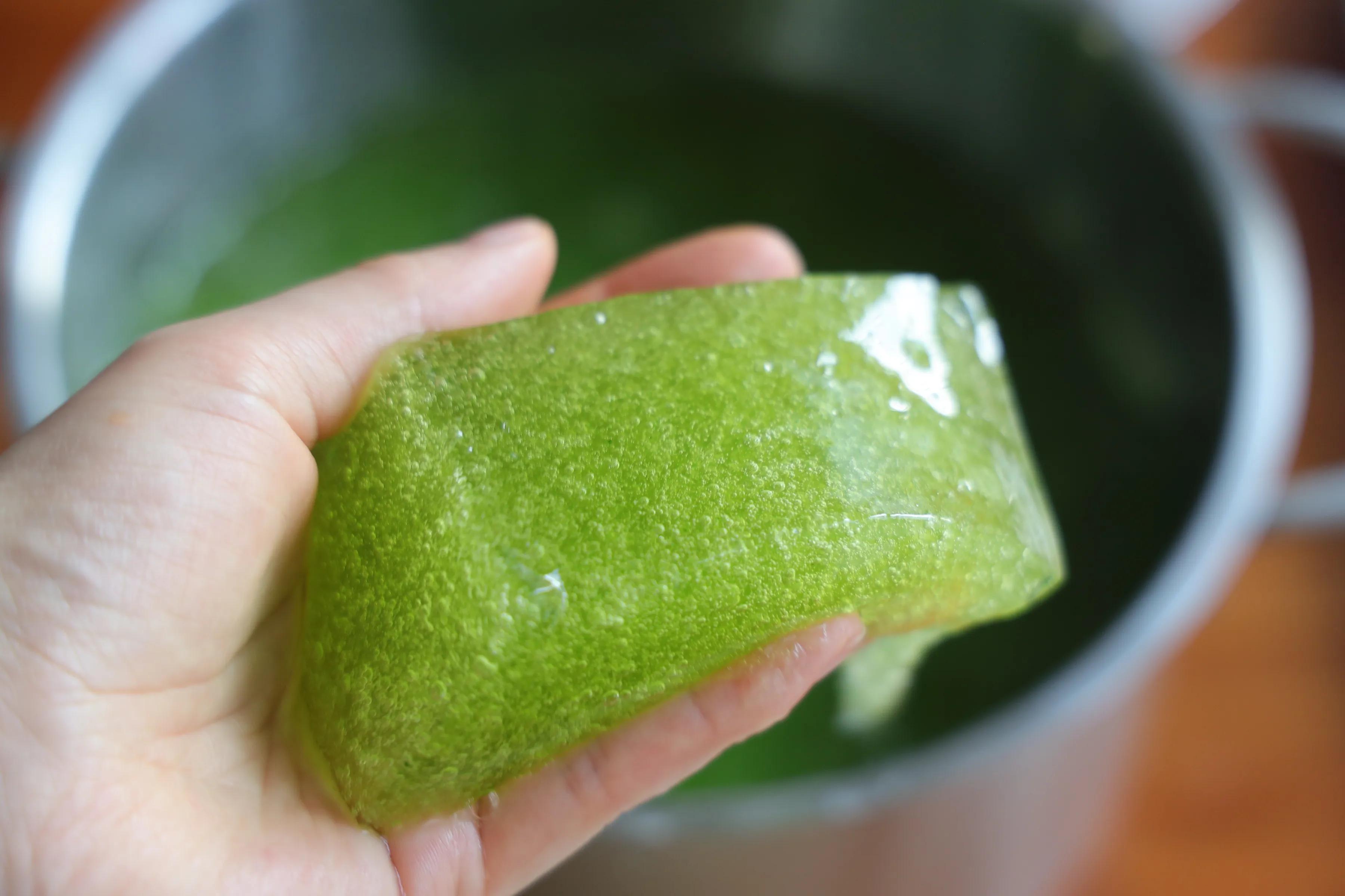 6、然后蓋上蓋子冰箱冷藏靜置1個小時,凝固之后取出來,切成小塊。再來看看綠色冰粉,顏色真的太漂亮了。