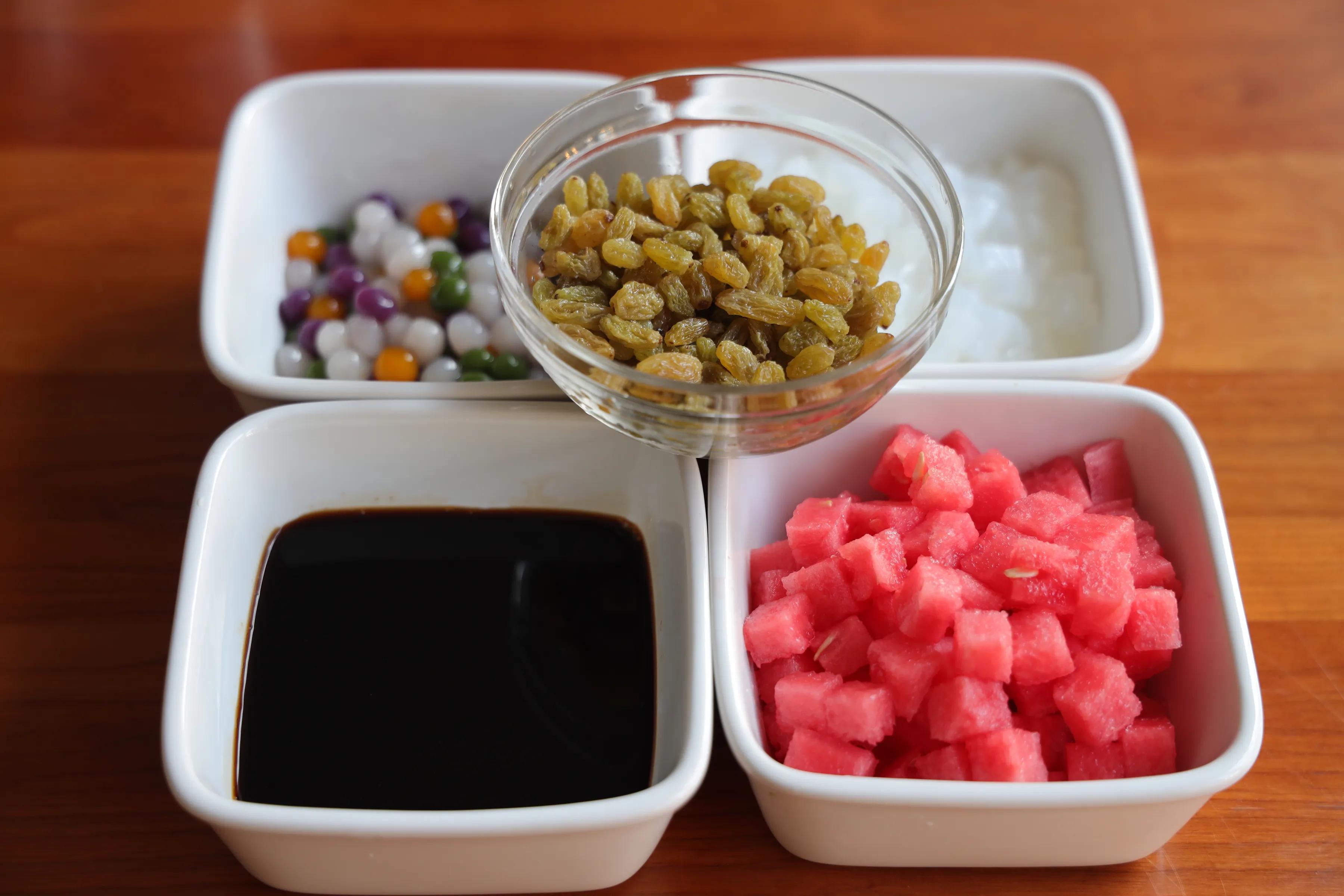 7、我們再準備一些自己喜歡的配料:紅糖水、芋圓丸子、水果丁、葡萄干......