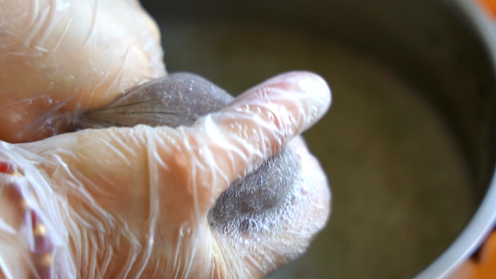 4、先用搓衣服的方式搓洗,然后再用擠壓的方法分離出粘液,一直放在水里擠壓,成品泡泡就會比較少,口感也比較Q彈,在水外面擠壓,成品的氣泡就會比較豐富。哪種方法都可以。直到擠壓出這樣豐富的泡泡,粘液也沒有了,全程8分鐘左右。最后水變成這樣粘黏的,還有豐富的氣泡;