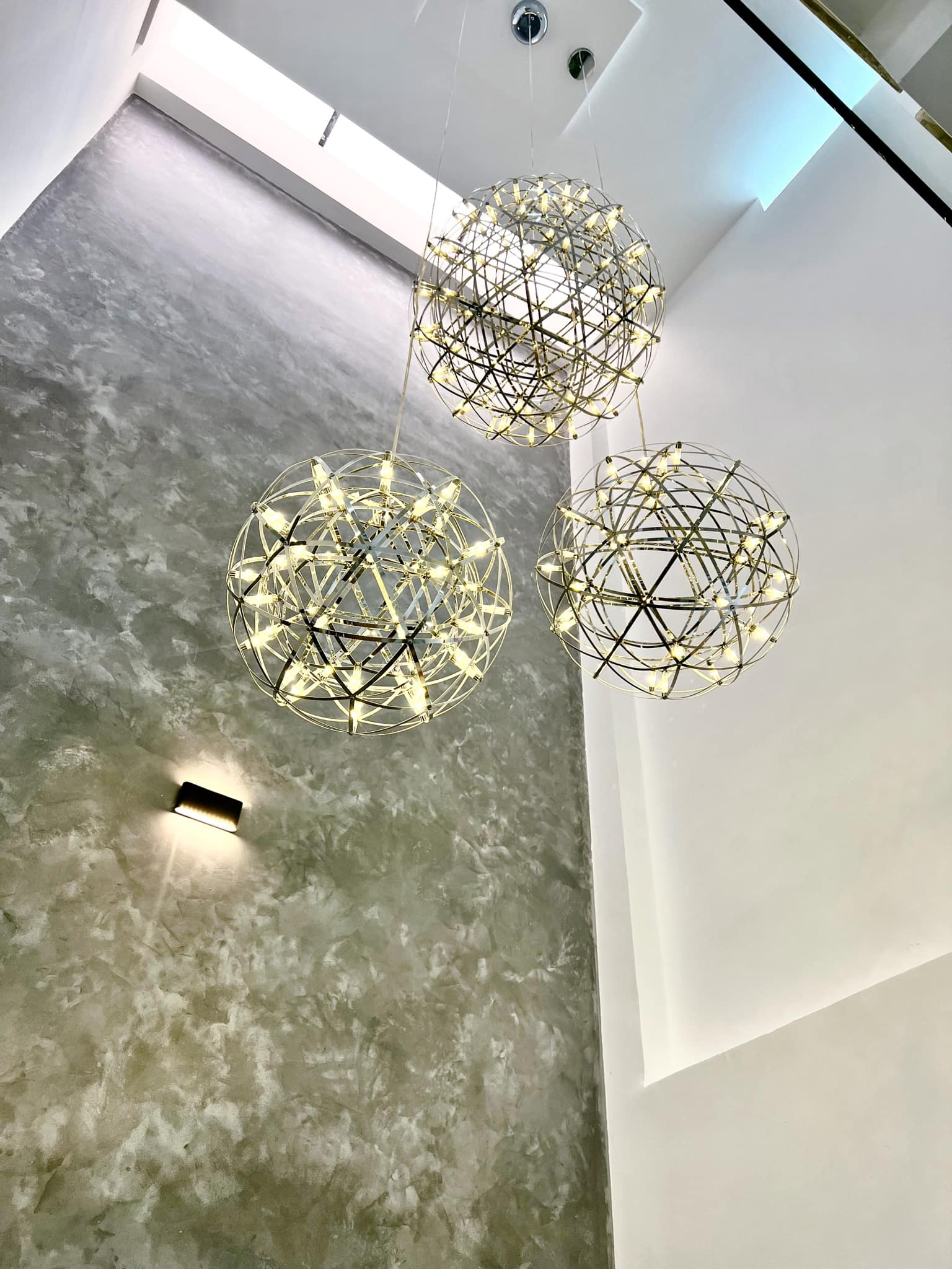一側墻面使用藝術壁紙裝飾,壁燈和筒燈進行燈光的烘托,底部擺放花壇種上各種綠植,打造處餐廳一側的端景墻。比起別人家的別墅在餐廳或是客廳位置進行挑高,他家則選擇了在這里,不占空間又改善了采光。