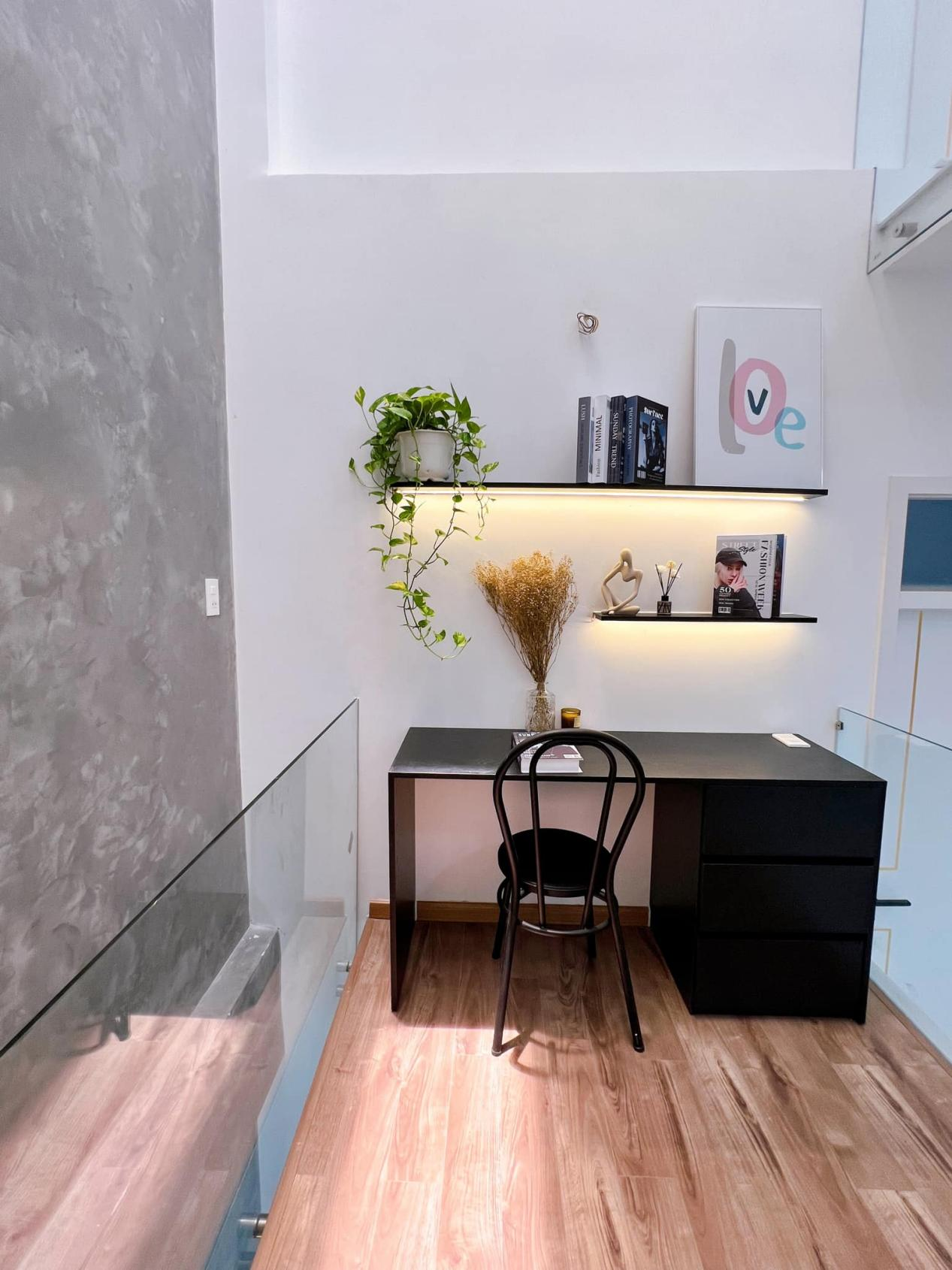 看完一樓,我們再來看看二樓,大廳位置擺放了書桌、打造了書架,在這里設計出一塊居家學習、辦公的空間,安靜不被打擾。