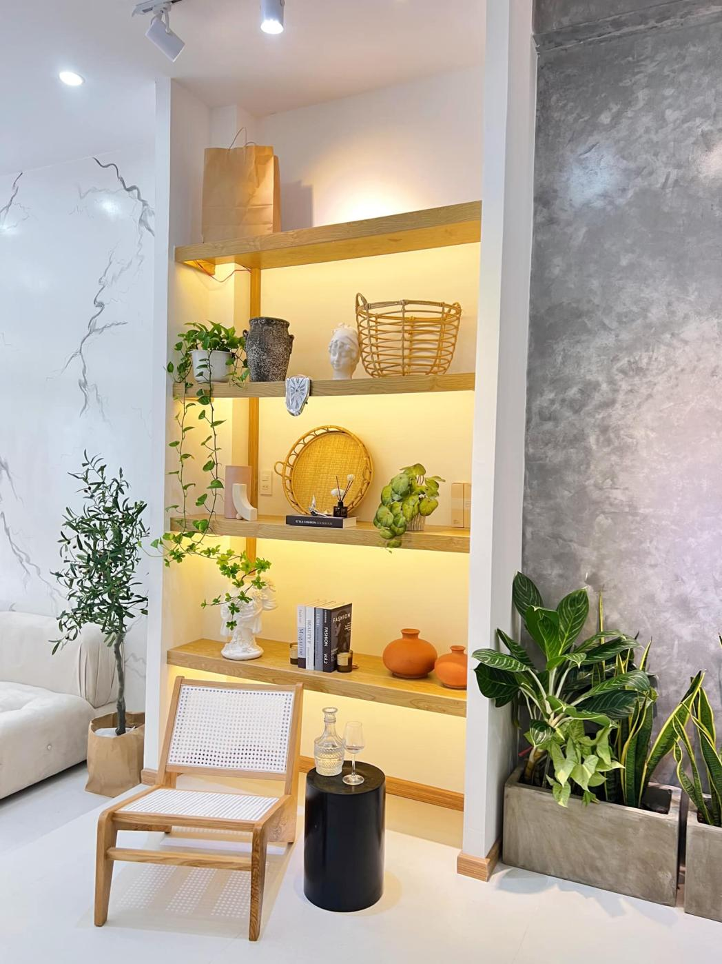 客廳和餐廳之間的墻面打造置物架,收納裝飾品和書籍等,再擺放上小茶幾和靠背椅,平時可以坐在這里看看書、喝喝茶,簡單的休息一下。