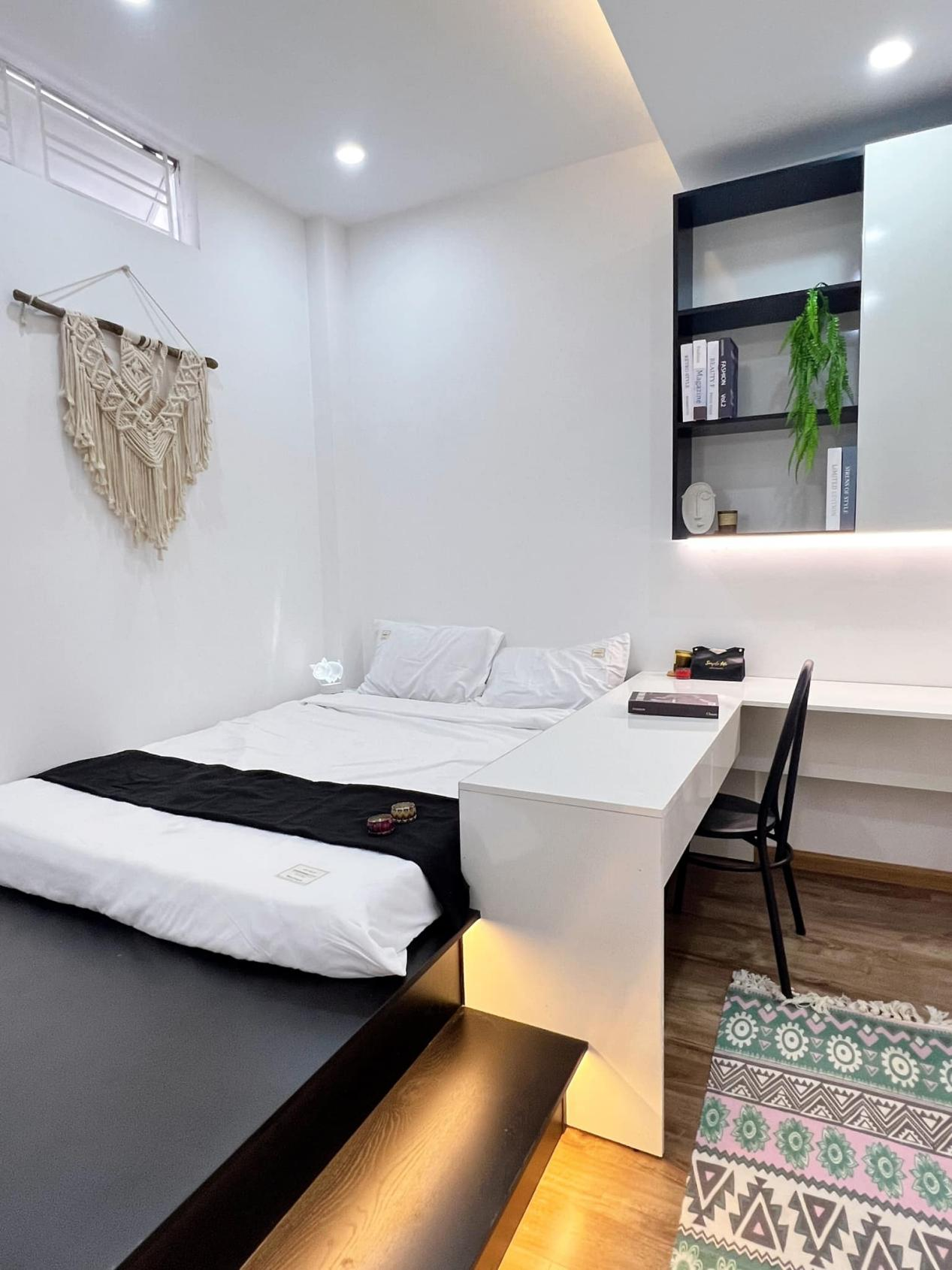 次臥打造臺階式地臺床,裝上燈帶,晚上也不怕磕著碰著。一側設計一體式書桌,一點空間也不浪費。