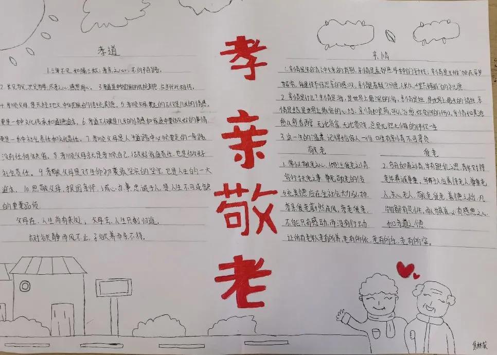 孝親敬老是中華民族的傳統美德,是我們每個人的責任和義務。通過制作孝親敬老手抄報,我們可以更好地理解這一美德的內涵,表達我們對親人的關愛和敬意,同時也可以傳遞正能量,弘揚社會正氣,讓我們的社會更加和諧美好。