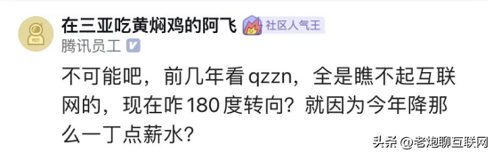 有網友對此發出了質疑:不可能吧,前幾年看qzzn,全是瞧不起互聯網的,現在咋180度轉向?就因為今年降那么一丁點薪水?