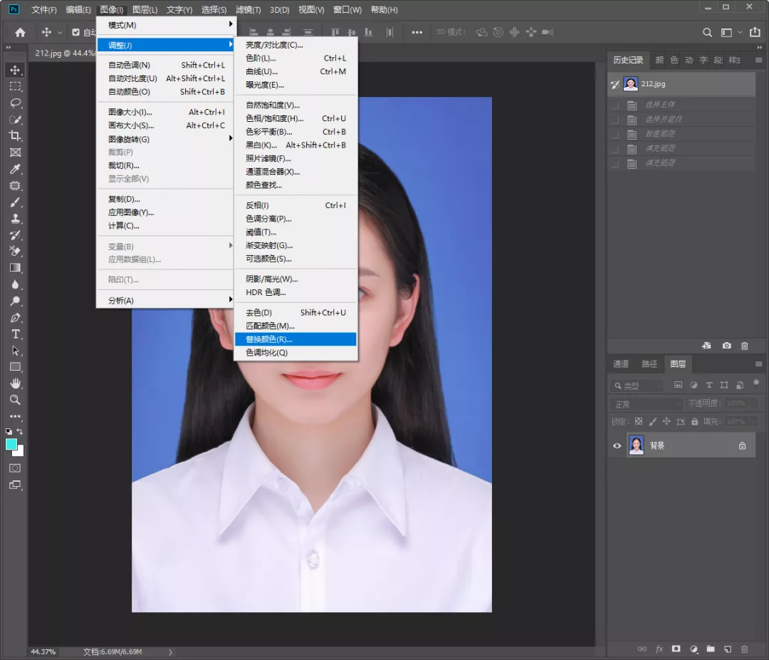 導讀證件照是我們生活中最常用的東西有時候需要用到紅底,藍底,白底等剛好自己又沒有這個底色的證件照,怎么辦呢?下面,小勇就來教大家如何更改證件照底色的三種方法。第一種執行圖像-調整-替換顏色這個時候會發現,