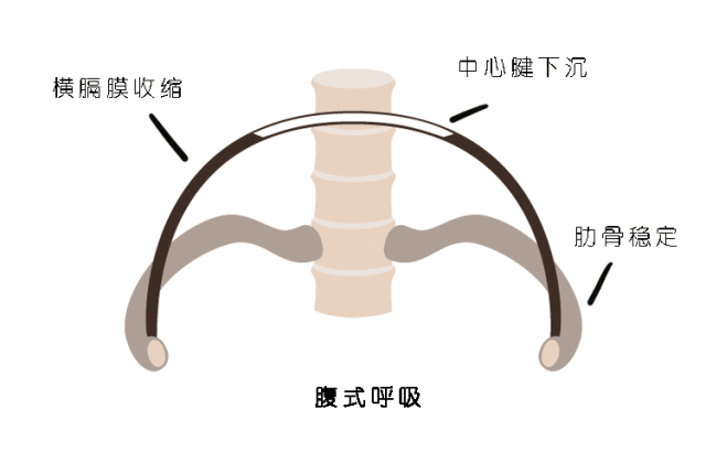 當肋骨下端穩定,橫膈膜收縮時,中心腱就會下沉。而此時腹腔的體積不變,卻被向下壓,想象腹腔是個裝滿水的氣球,當上面被擠壓,就會向外突出來。這就是腹式呼吸。