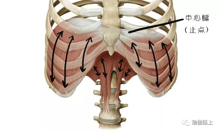 當中心腱穩定,橫膈膜收縮時,肋骨就會上提,胸腔就會向前、向兩側和向后去擴張。這就是胸式呼吸。