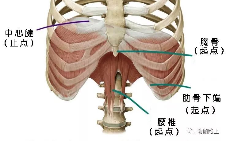 橫膈膜的四周和胸骨、下肋骨和腰椎前側連接,我們把這些點稱為(橫膈膜)肌肉的起點。