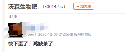 12月5日晚間,沃森生物股吧有股民表示:“快要下蛋了,把雞殺了”。