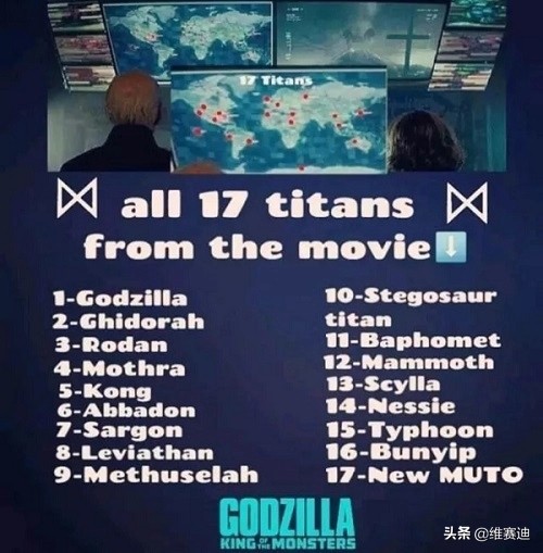 根據帝王計劃組織的人員歸類,一共將地球上的17只巨型怪物列入名單,也就是所謂的“泰坦巨獸”,其中包括哥斯拉以及《怪獸之王》里登場的基多拉、魔斯拉與拉頓。