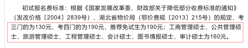 湖北研究生報名費考三門的為130元;考四門的為190元;推薦免試生報考費為190元;工商管理碩士、公共管理碩士、旅游管理碩士、工程管理碩士、會計碩士、圖書情報碩士、審計碩士報名考試費為160元。