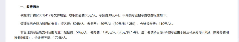 天津研究生報名費收取報名費50元/人、考務費30元/科。管理類聯考科目的專業:合計報考費:110元/人。非管理類聯考科目的專業:合計報考費:170元/人。