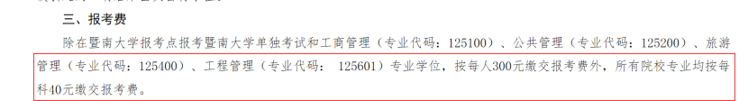 廣東研究生報名費除在暨南大學報考點報考暨南大學單獨考試和工商管理(專業代碼:125100)、公共管理(專業代碼:125200)、旅游管理(專業代碼:125400)、工程管理(專業代碼:125601)專業學位,按每人300元繳交報考費外,所有院校專業均按每科40元繳交報考費。