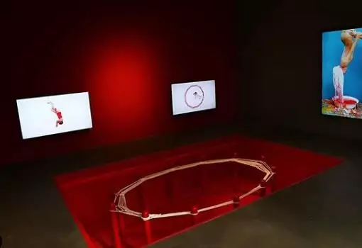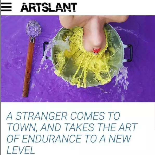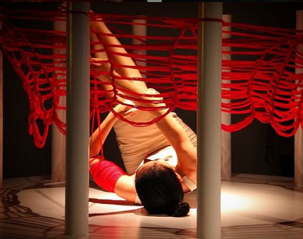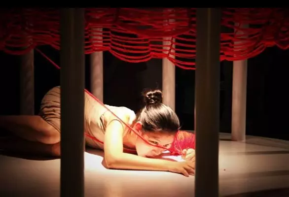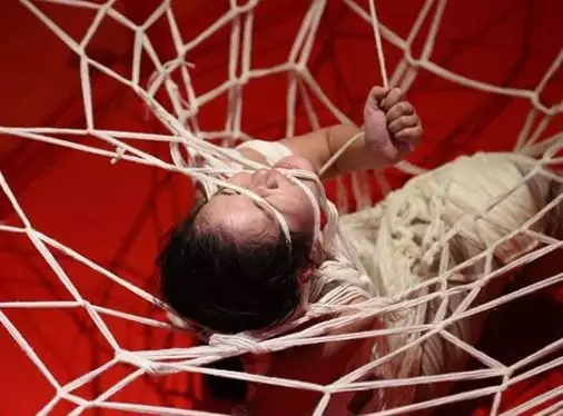 “織”這個作品是由12根柱子組成一個圓,Kawita本人會在手臂和大腿上纏繞紅色的棉線,把自己當作織針,在圓的中央用四肢掙扎著進行編織。實際的作品非常震撼,具體的過程大家可以在采訪視頻中看到。