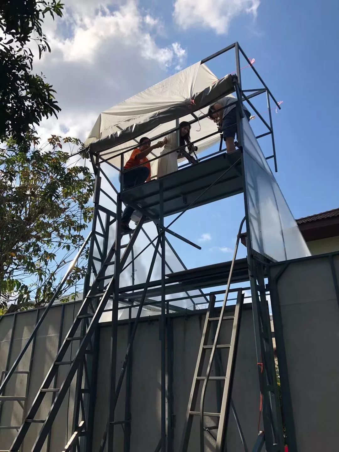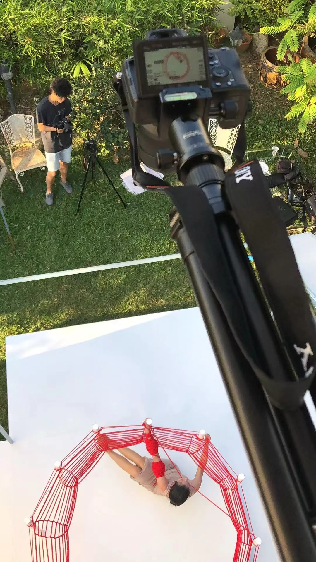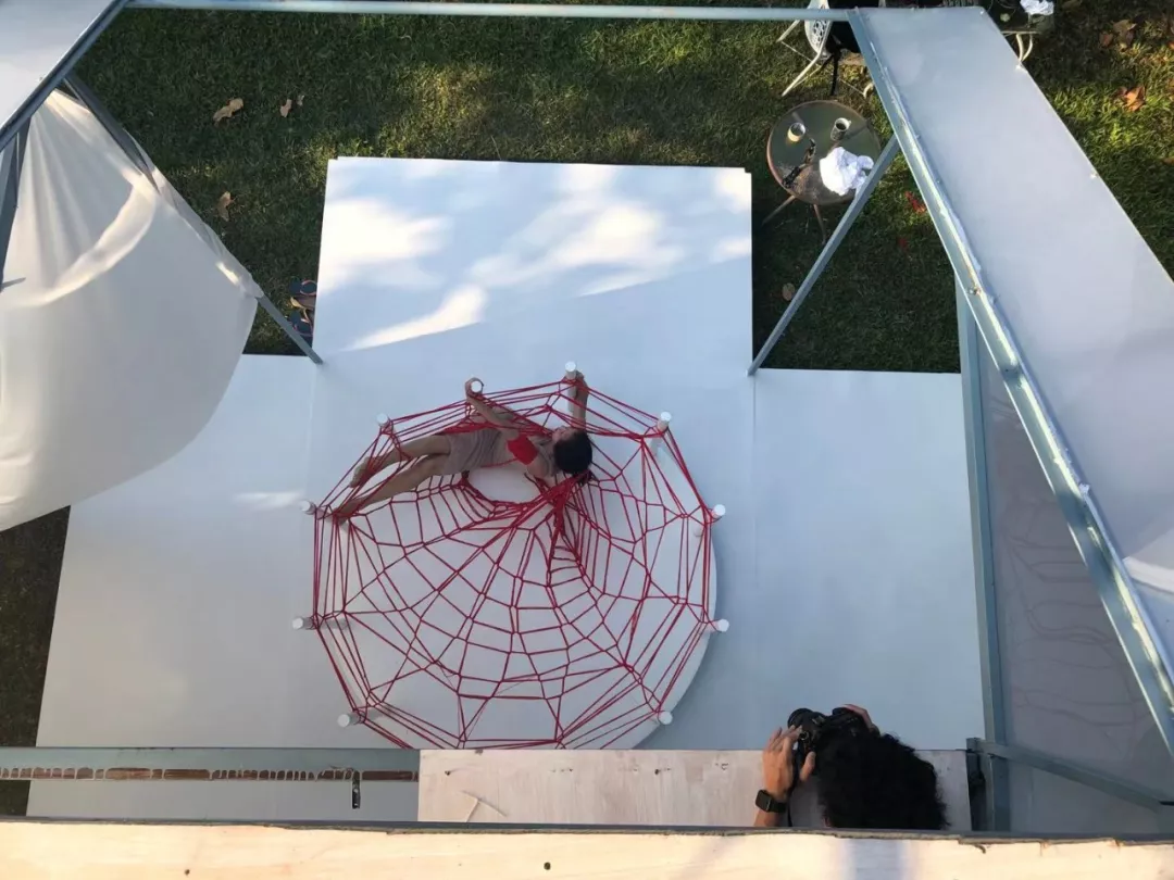 我們有幸參與了“織”這一作品視頻部分的拍攝制作,在現場感受了一次Kawita作品的震撼。拍攝需要大量的前期工作,為了合適的角度,除了搭建“織機”,還需要搭建一個3層的腳手架。