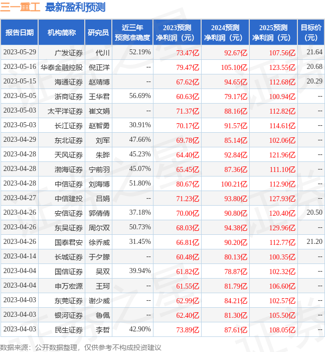 該股最近90天內共有23家機構給出評級,買入評級21家,增持評級2家;過去90天內機構目標均價為20.34。根據近五年財報數據,證券之星估值分析工具顯示,XD三一重(600031)行業內競爭力的護城河優秀,盈利能力良好,營收成長性優秀。財務可能有隱憂,須重點關注的財務指標包括:應收賬款/利潤率、應收賬款/利潤率近3年增幅。該股好公司指標3.5星,好價格指標3.5星,綜合指標3.5星。(指標僅供參考,指標范圍:0 ? 5星,最高5星)
