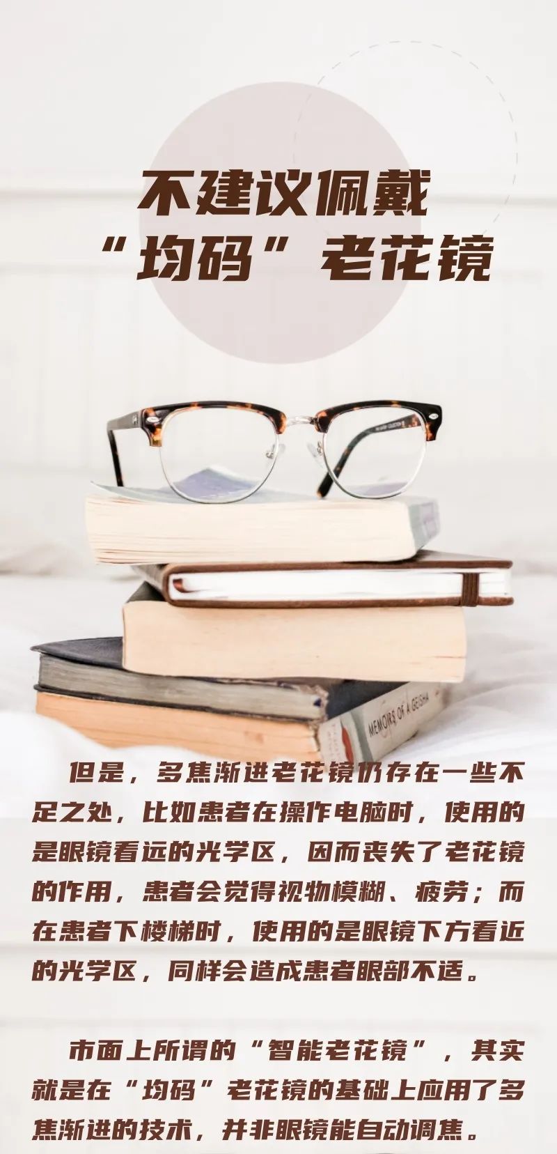 生活中,老年人常常會在電視上、手機上看到關于老花鏡的宣傳廣告,這些廣告中經常會出現“智能眼鏡”“自動調焦”“防藍光”“免費送”等詞語,不少老年人被這些詞語吸引。那么,這些說法有科學依據嗎?“免費送”的老花鏡能戴嗎?