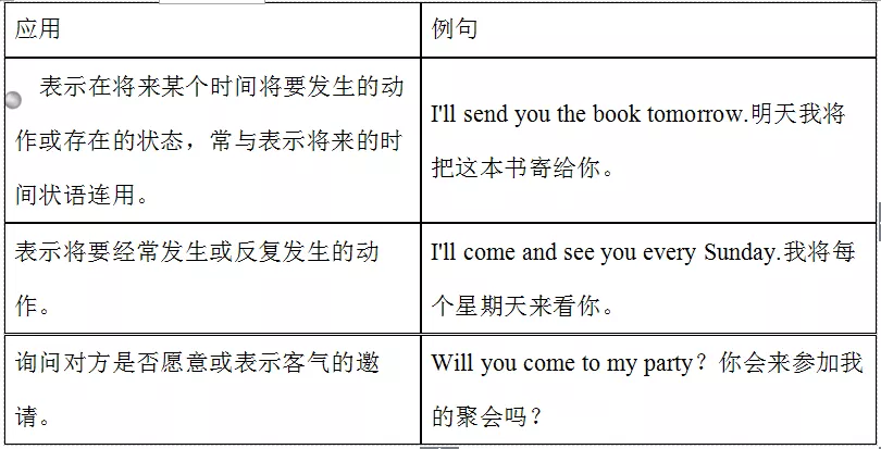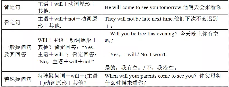 “will +動詞原形”是一般將來時最常見的形式,它表示單純的將來,不表示計劃、打算,可以用于各種人稱。