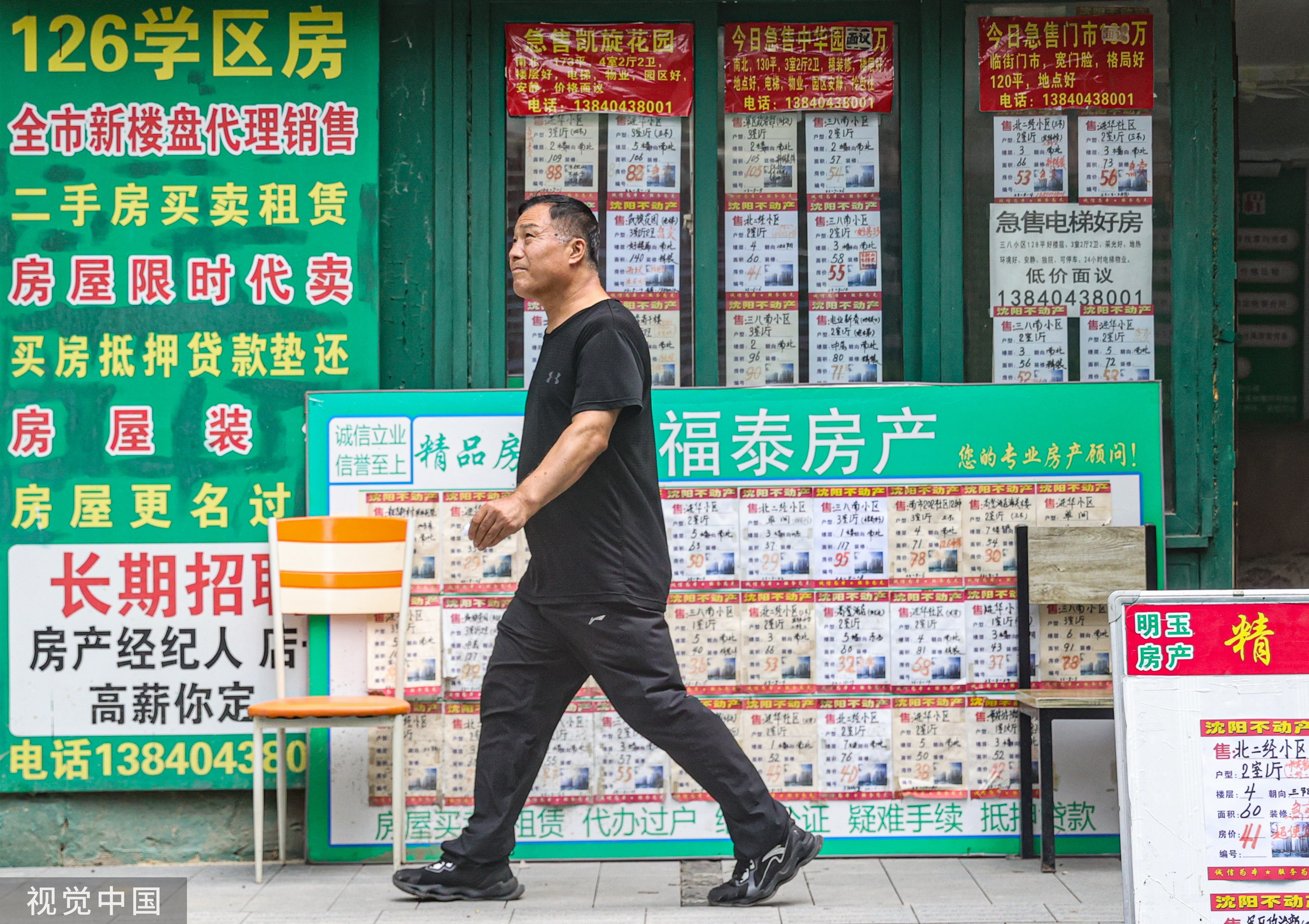 2023年8月3日,沈陽,市民在一房產中介貼出的學區房、二手房信息旁經過。圖源:視覺中國