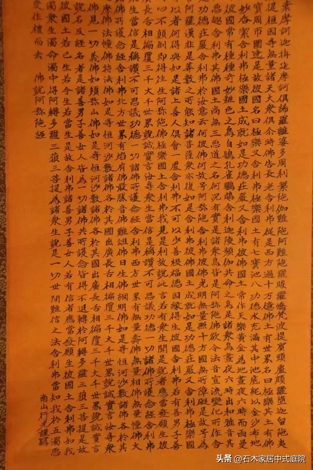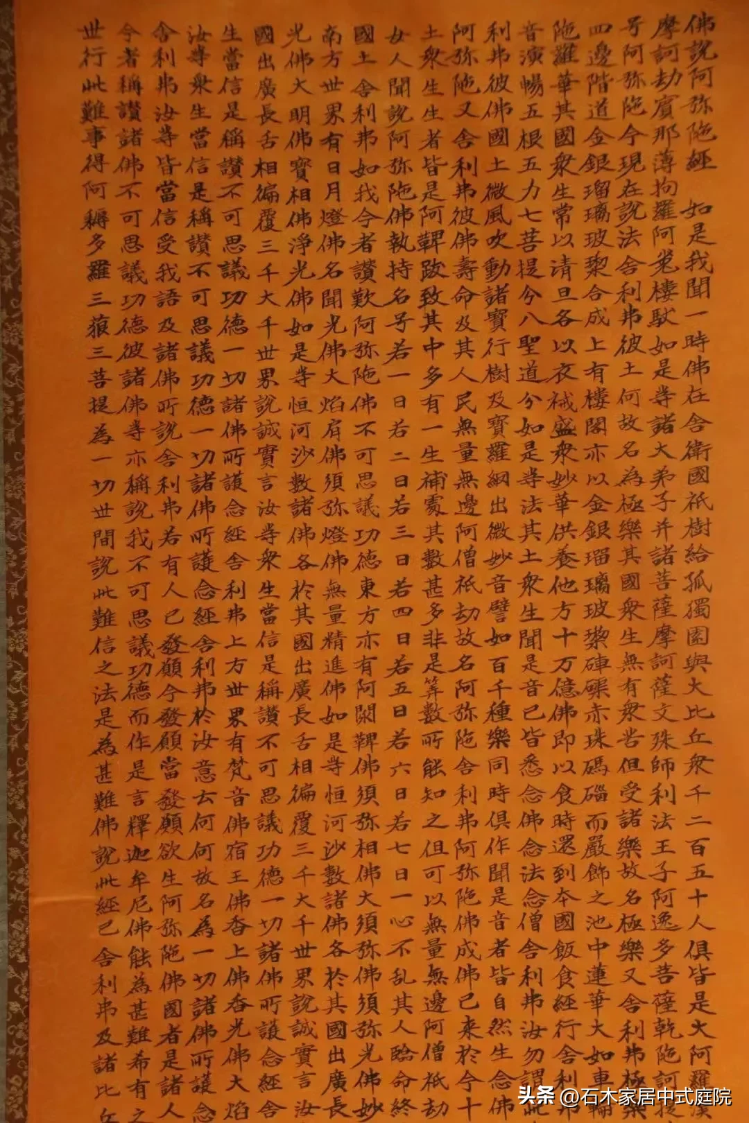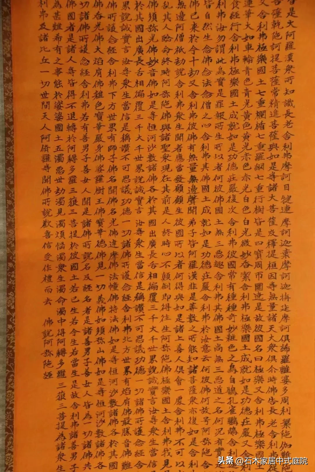 導讀佛說阿彌陀經——字幅?《佛說阿彌陀經》是大乘佛教經典之一,《佛說阿彌陀經》是一本極少數非由佛陀弟子提問,而由佛陀不問自說的經典。尺寸高193厘米, 寬56厘米。佛經?