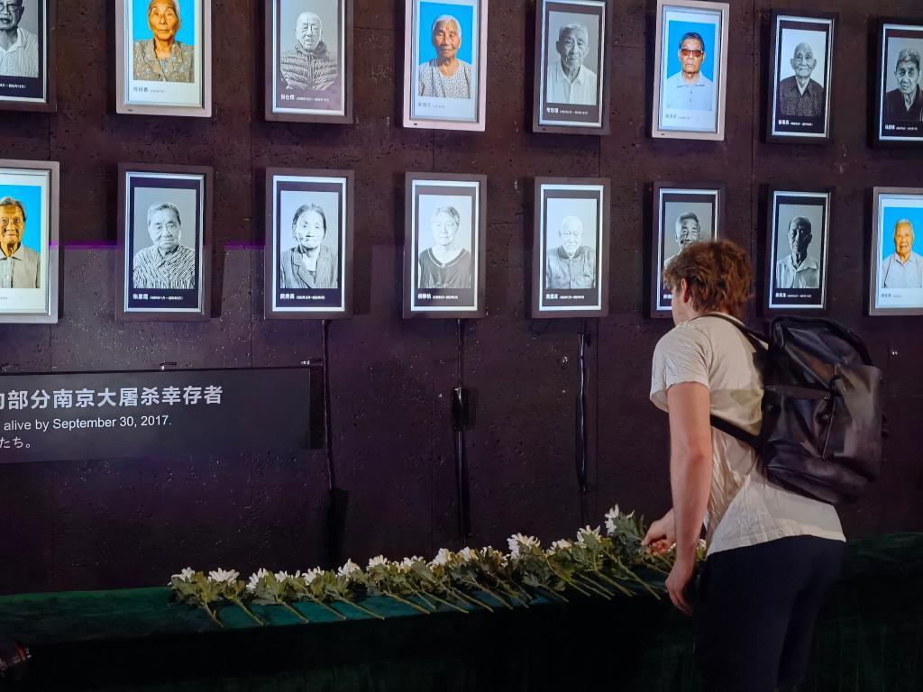 8月15日,國際友人為離世的南京大屠殺幸存者獻花。 新華社記者邱冰清 攝