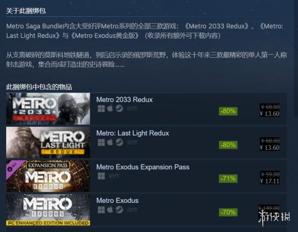 包含系列三部游戲:《地鐵:2033》增強版、《地鐵:最后的曙光》增強版、《地鐵:離去》黃金版,并包含所有可下載內容。