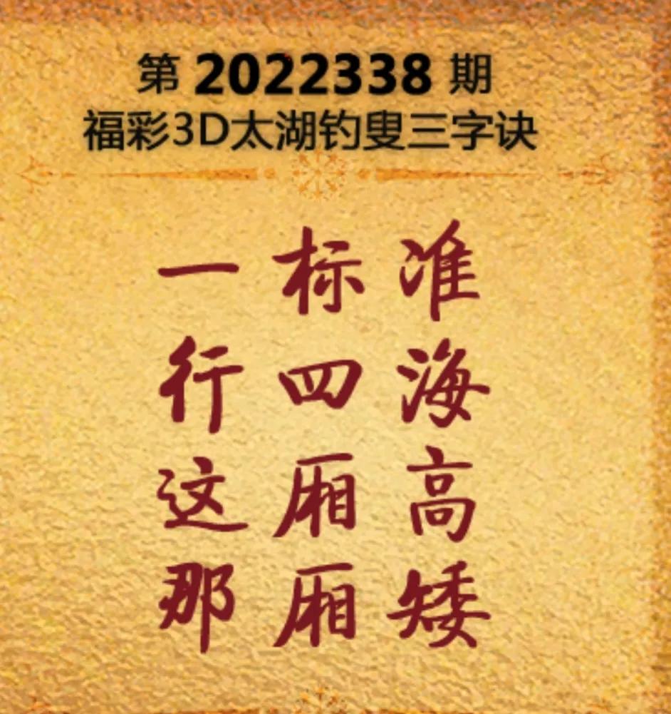 太湖字謎又稱太湖釣叟三字訣由太湖釣叟每天發布,歷史太湖字謎最早發布于2004年,已經快有二十年的歷史,四行十二字,內容千變萬化,包羅萬象。字謎內容時而簡單明了,時而晦澀難懂,有時緊跟時事編成字謎,有時夾雜大量的歷史故事和典故,通常準確的解讀字謎需要下一番功夫,在太湖字謎的解讀上,很多人都有自己獨特的見解,太湖字謎之所以叫做太湖三字訣,關鍵核心在這個訣字里面,要結合字謎的意境判斷字謎表達的內容,然后根據情況去分析每一句描述的意思。字謎本身也是太湖釣叟對開獎號碼的一種預測,有時也不能確保一定準確,相比于盲目地選擇號碼,解讀字謎還是有很大的益處,對于沒有時間研究號碼走勢,和看不太懂走勢的朋友,可以關注我。