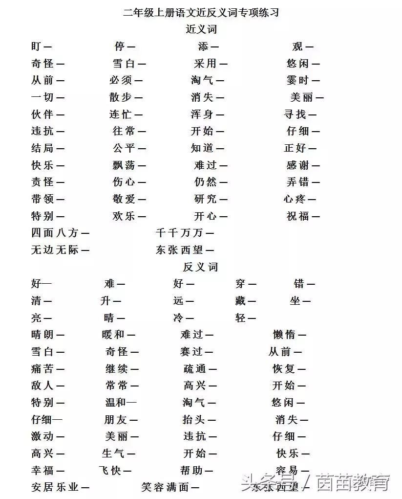 導讀本份練習是根據人教版一年級上冊課本制作的,涵蓋了本冊中的重點詞組,但是答案并不唯一。參考答案近義詞盯—看 停—止 添—加 觀—看 奇怪—奇異 雪白—潔白 采用—運用 悠閑—輕閑從前—以前 必須—一定
