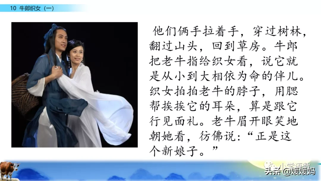 他和織女認識:老牛說:“明天黃昏的時候,你翻過右邊那座山。山那邊一片樹林,樹林前邊一個湖,那時候有幾個仙女會在湖里洗澡。她們的衣裳放在草地上,你要撿起那件粉紅色的紗衣,跑到樹林里等著,去跟你要衣裳的那個仙女就是你的妻子。這個好機會你可別錯過了。”