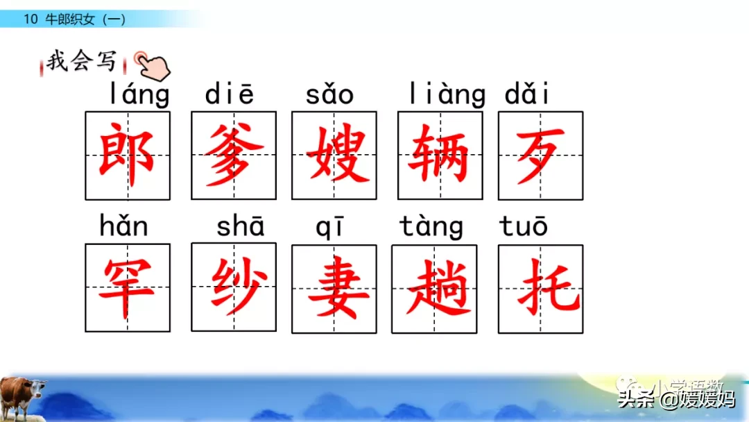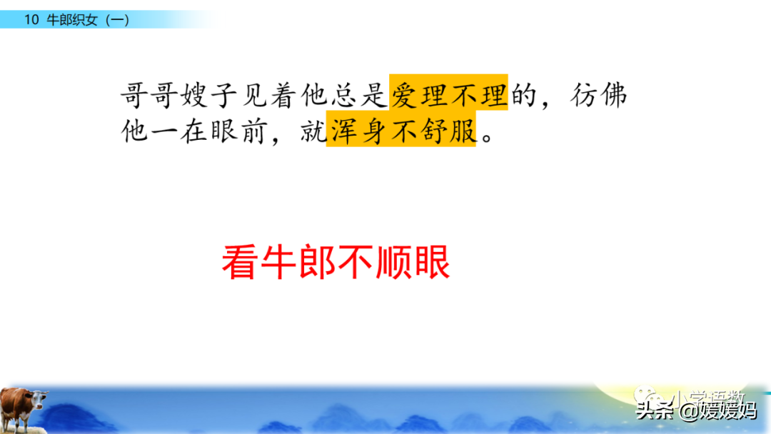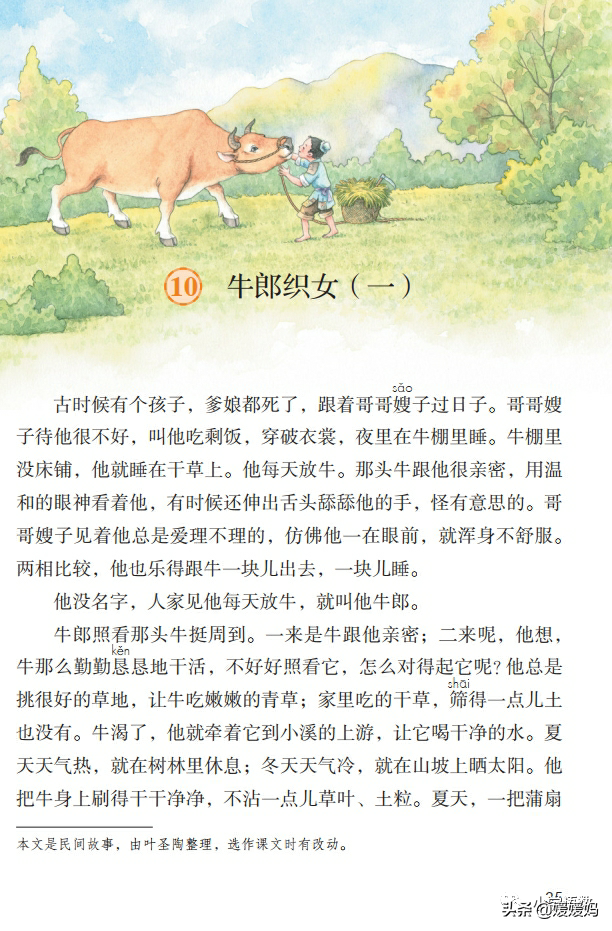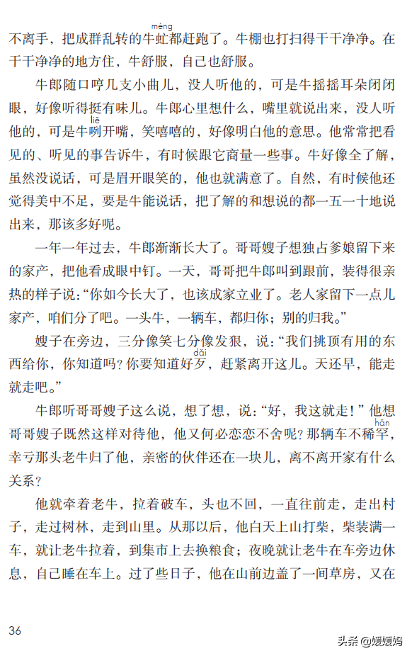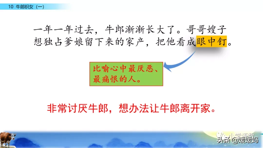 1.一年一年過去,牛郎漸漸長大了。哥哥嫂子想獨占父親留下來的家產,把他看成眼中釘。