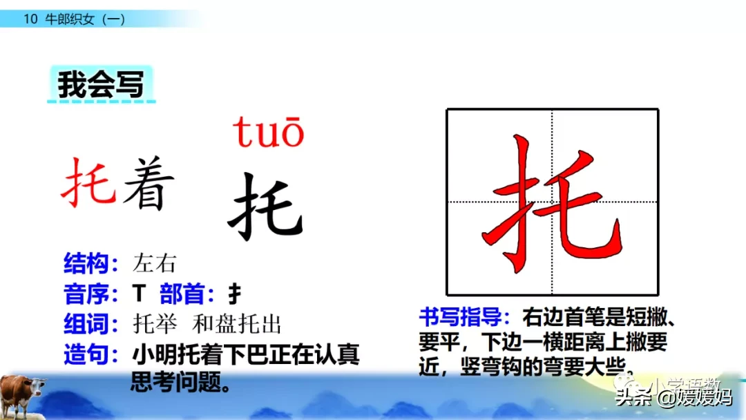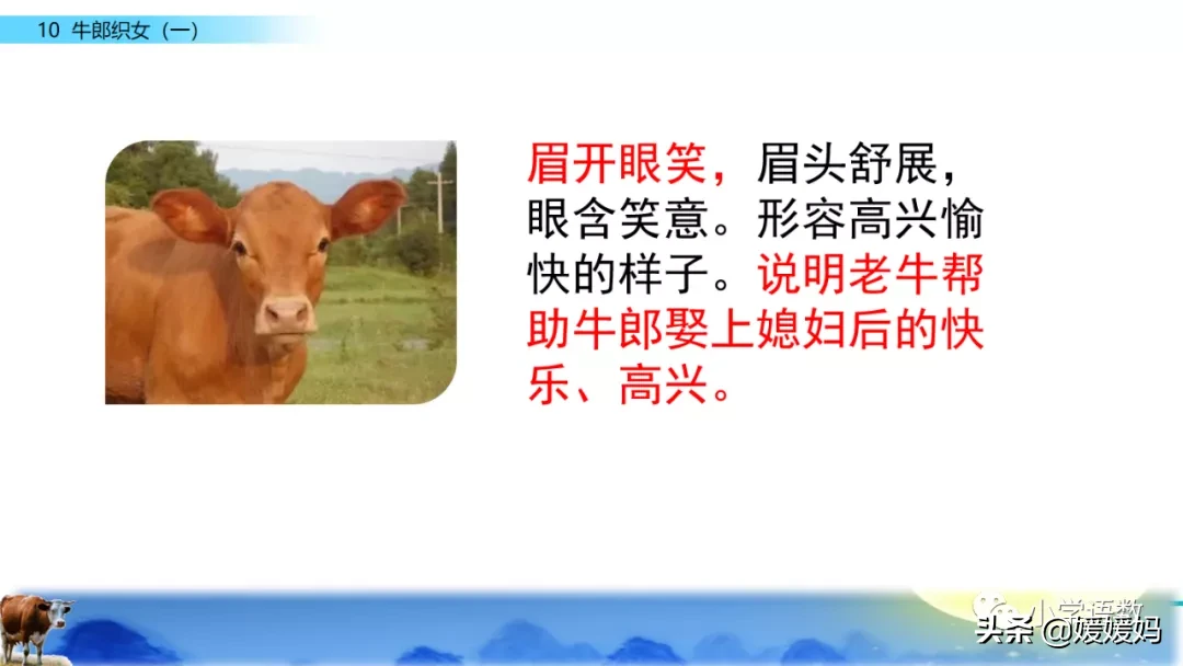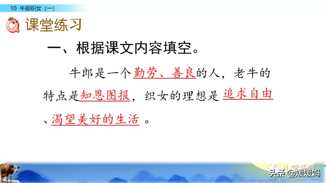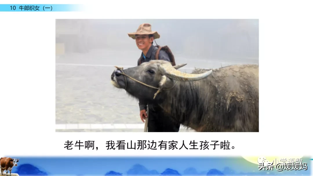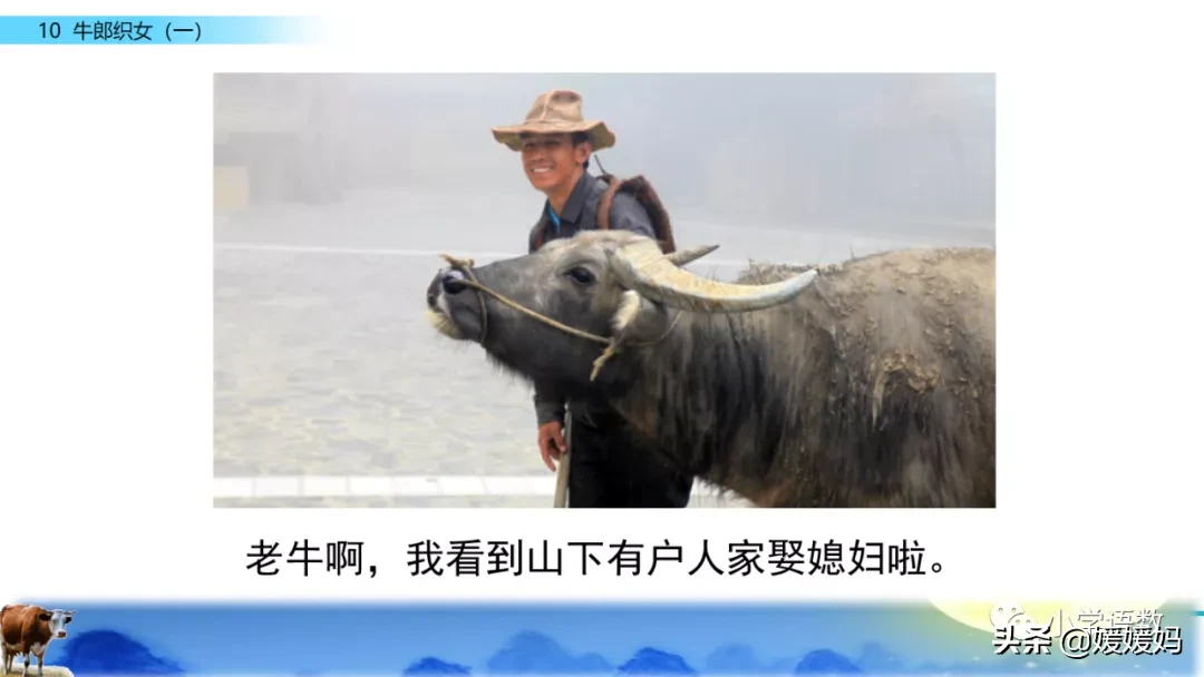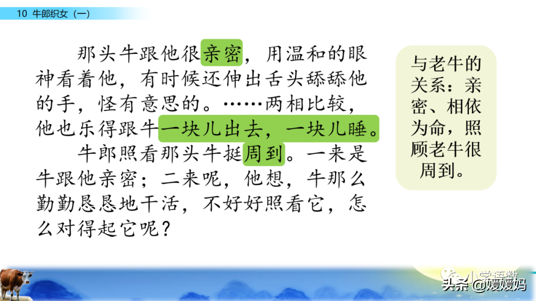 (注意講清牛郎對老牛吃的、喝的、住的方面,以及冬天、夏天時的精心照顧;講清老牛能聽懂牛郎哼的曲兒、說的心里話講的見聞等事例;講出牛郎與老牛相依為命的親密與默契。)