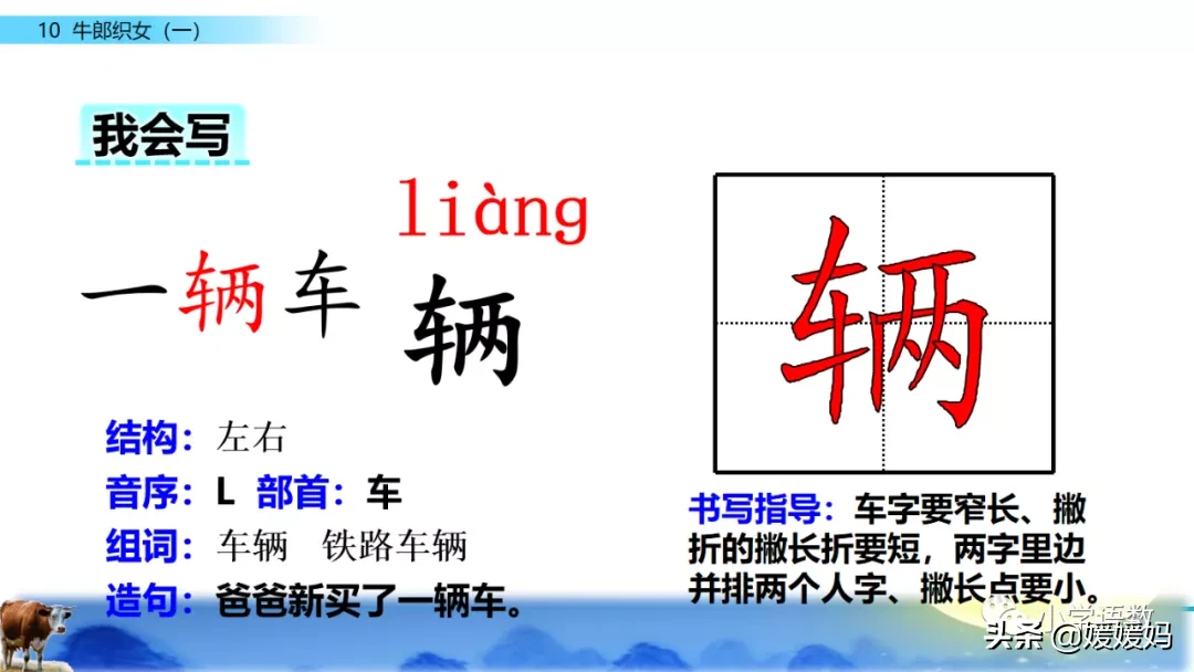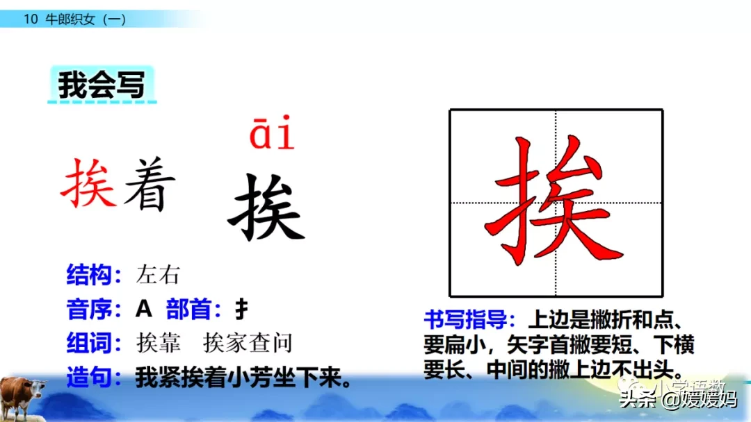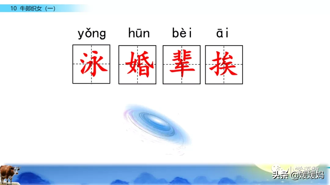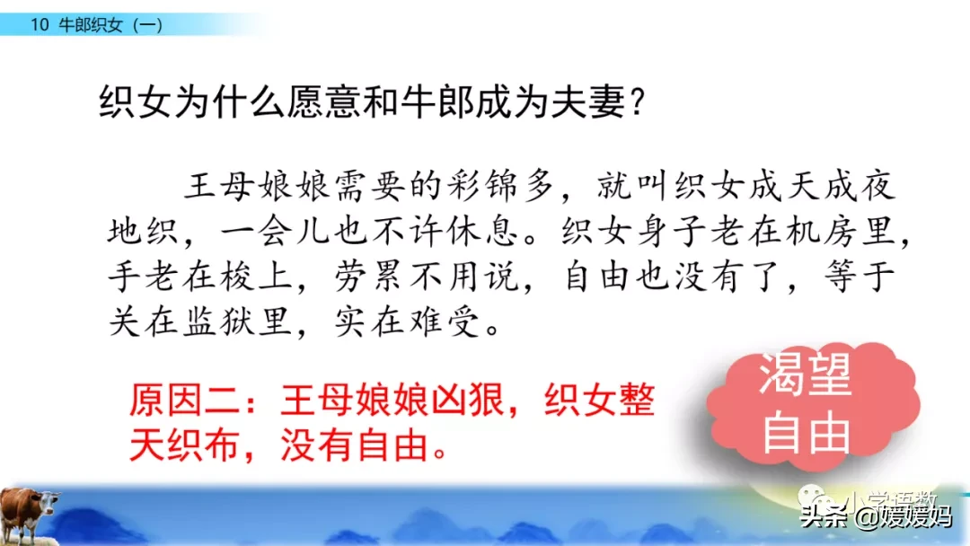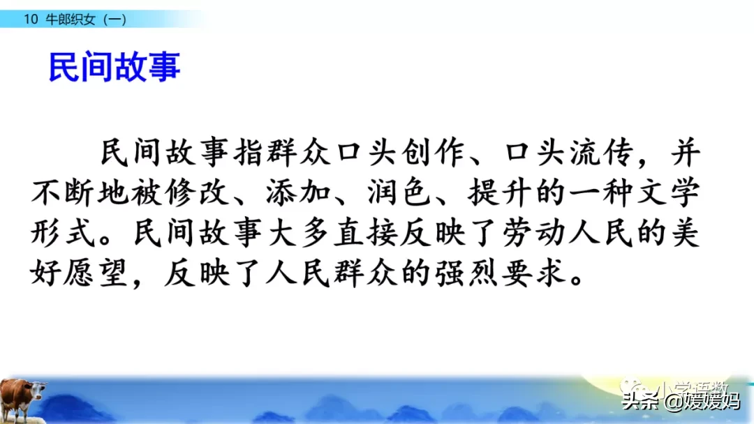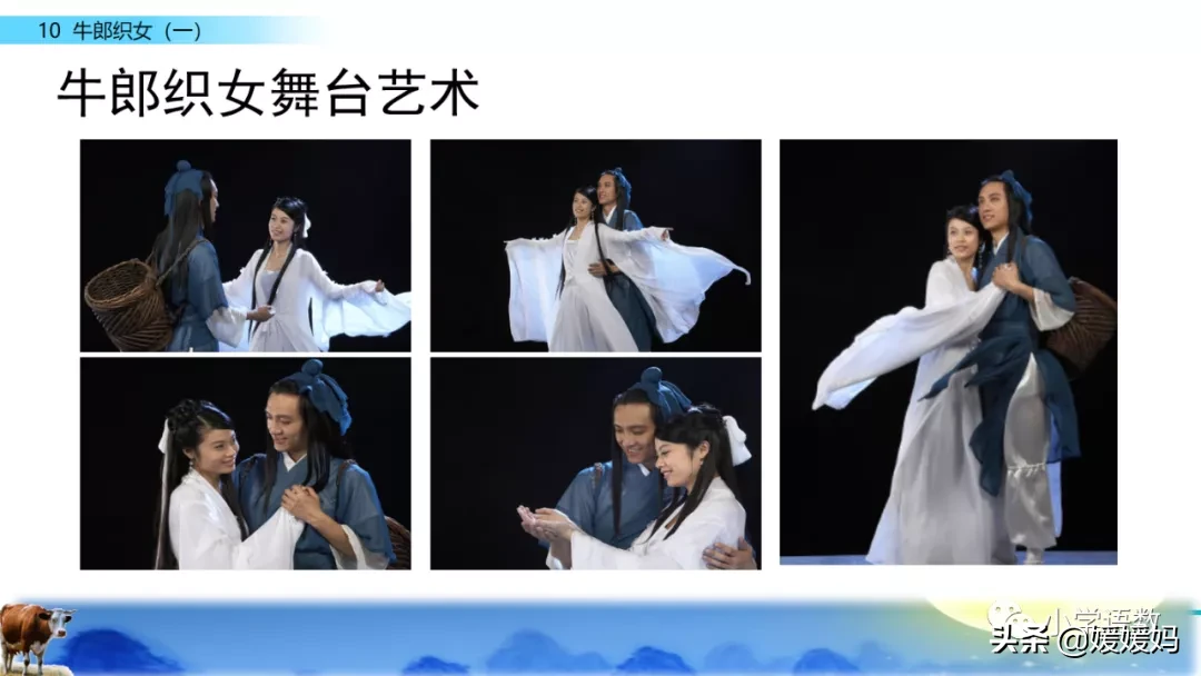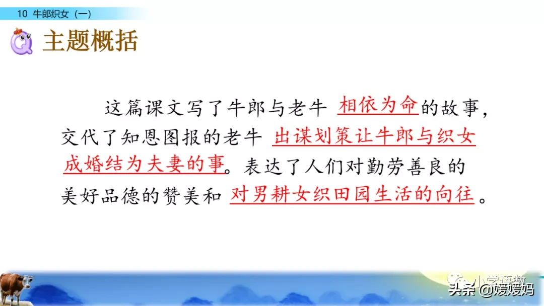 故事講述了牛郎從小遭哥嫂虐待,和老牛相依為命。在老牛的幫助下,牛郎和織女組成了幸福美滿的家庭,生下一兒一女。可是,他們卻被王母娘娘用一道天河相隔拆散,從此天各一方。最終,王母娘娘拗不過他們,允許他們每年七夕相會。《牛郎織女(一)》是故事的前半部分。雖篇幅較長,但結構清晰。以牛郎的成長經歷“童年——成人——成家”展開情節。第1-2自然段概括介紹了牛郎凄苦的身世;第3~8自然段講述了牛郎和老牛相依為命,結下了深厚的感情;第9自然段到課文結尾,講述了牛郎得到老牛相助,與織女相識的經過,此部分插敘介紹了織女在天宮的生活情況。