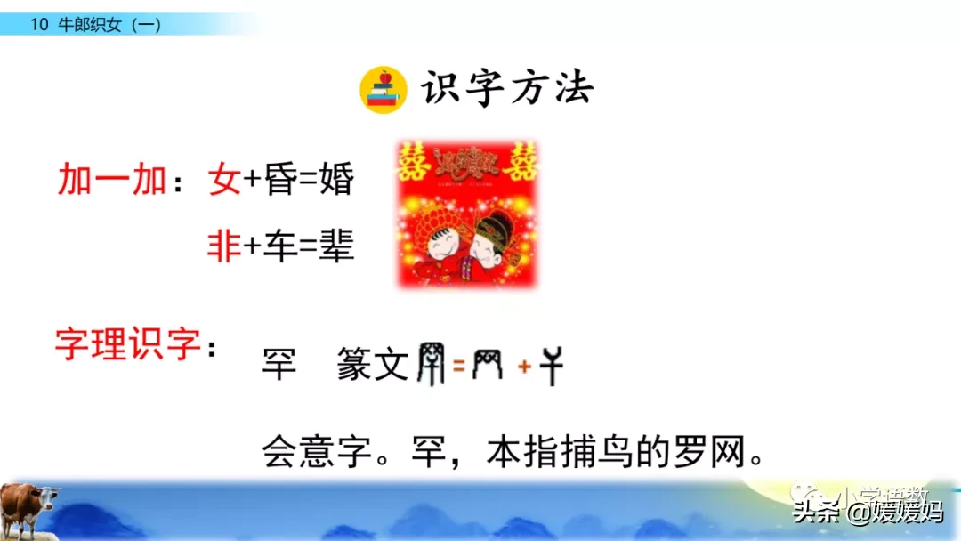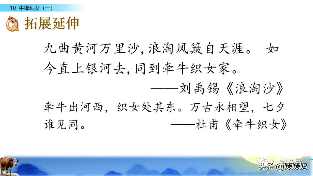 第三部分(9-21)到課文結尾,講述了牛郎得到老牛相助,與織女相識的經過。