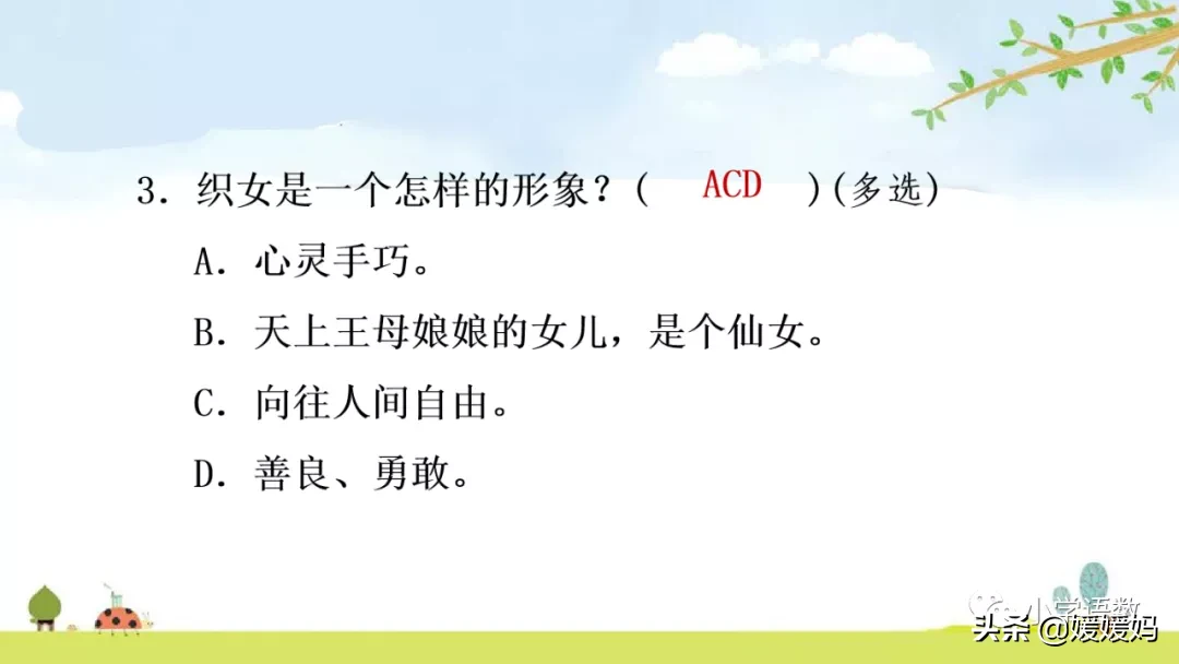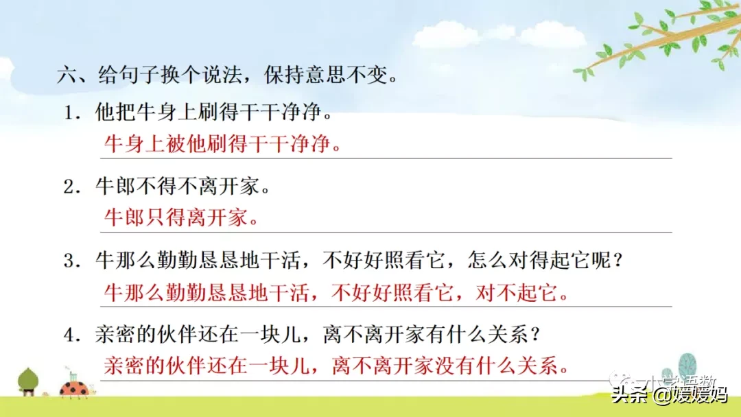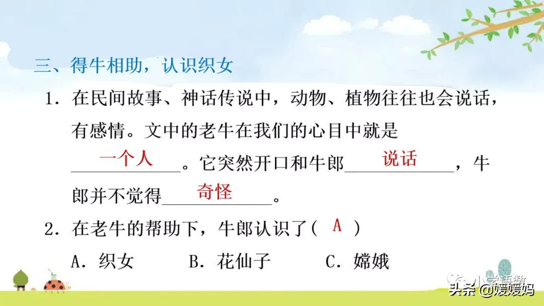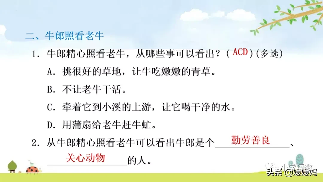 牛郞和老牛相處:牛郎照看那頭牛挺周到。一來是牛跟他親密,二來呢,他想,牛那么勤勤懇懇地干活,不好好照看它,怎么對得起它呢?他總是挑很好的草地,讓牛吃又肥又嫩的青草,家里吃的干草,篩得一點兒土也沒有。牛渴了,他就牽著它到小溪的上游,讓它喝干凈的水。夏天天氣熱,就在樹林里休息;冬天天氣冷,就在山坡上曬太陽。他把牛身上刷得干干凈凈,不讓有一點兒草葉土粒。