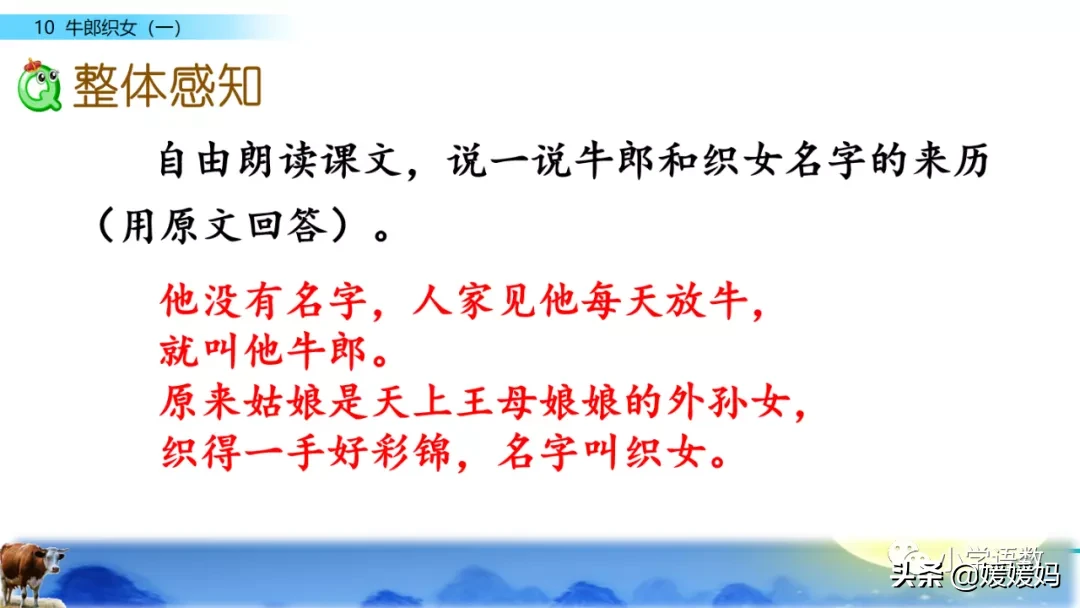 1.默讀課文,說說牛郞和老牛是怎么相處的,他和織女是怎么認識的?