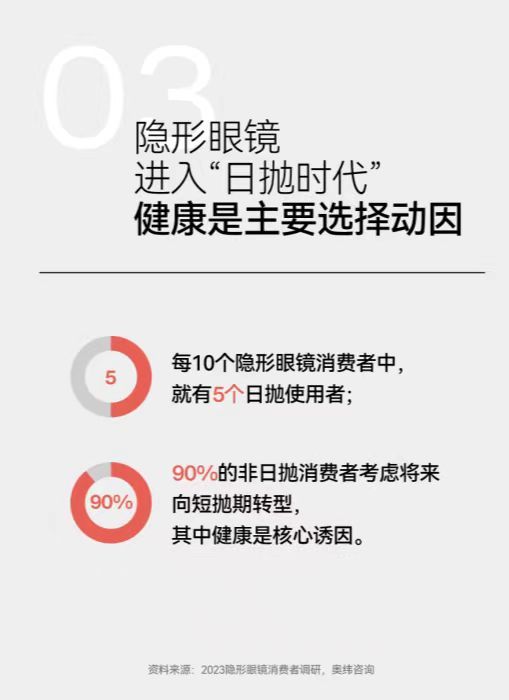 《報告》顯示,在佩戴隱形眼鏡的人群調查中,日拋使用人數占比呈現不斷上升趨勢,在日常工作場景中,人們更愿意選擇佩戴健康舒適的日拋產品,日拋隱形眼鏡顯然已成為隱形眼鏡市場大勢。