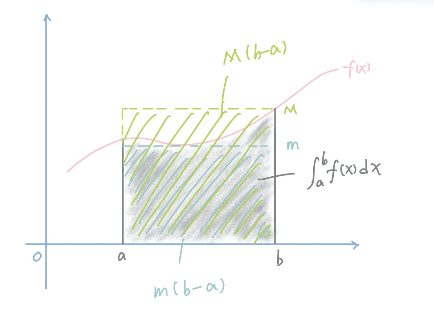 上圖當中灰色陰影部分就是定積分的結果,藍色的矩形面積是m(b-a),大的矩形面積是M(b-a)。