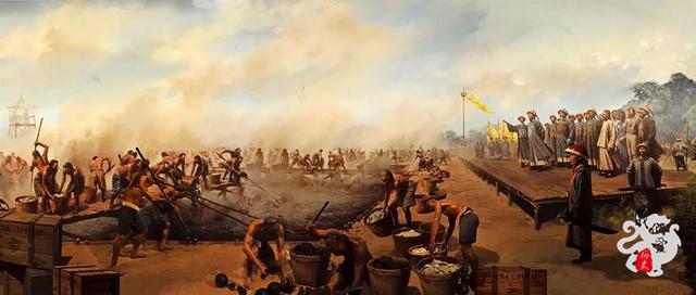 于是,在林則徐的操作下,從1839年6月3日起,這個震撼的大場面上演了:虎門太平鎮的高地上,兩個十五丈的深池子,池地全是用石板鋪好,先放入鹽鹵,再倒入石灰,把鴉片銷毀后再沖到海中。癮君子們想接著抽?下海找鯊魚去吧!
