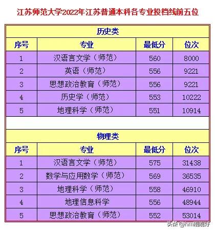 2、2022年江蘇高考普通本科各專業最低投檔分前五位——