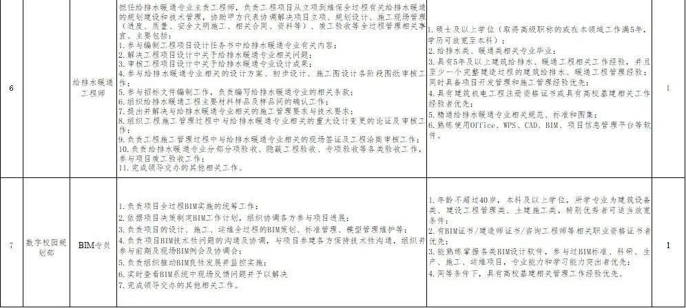施工管理崗(水利方向)2人,安全質量崗1人,資金管理崗1人,核算會計崗1人,工程管理崗1人,綜合文字崗1人,設施管理崗(環衛方向)1人,產業發展崗1人。