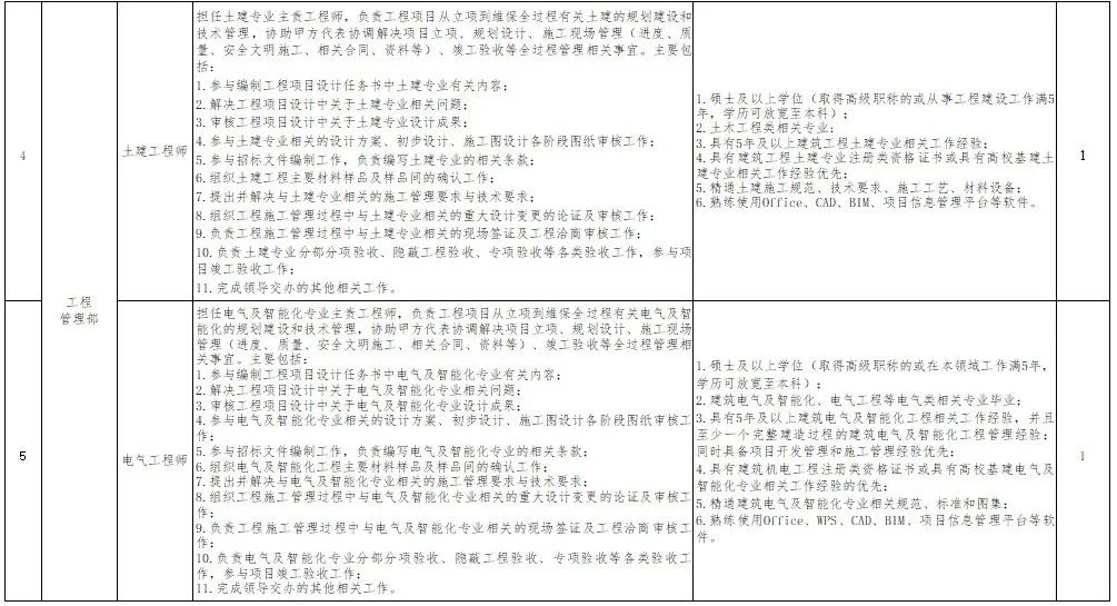 運營管理崗(營銷策劃、產業招商)2人,設計管理崗(精裝、智能化)2人,質量管理崗1人,成本管理崗(土建)1人,BIM管理崗1人。