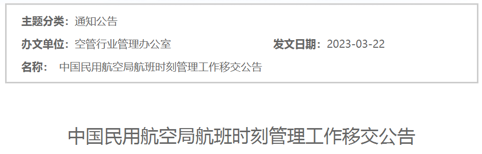 公告表示,自2023年3月26日零時起,中國民用航空局各地區管理局不再承擔組織協調中國民用航空局航班時刻管理工作,此項工作移交至中國民用航空局航班時刻管理委員會負責,具體由中國民用航空局航班時刻管理委員會辦公室(中國民用航空局空管行業管理辦公室)組織協調,時刻協調工作機構負責編排。