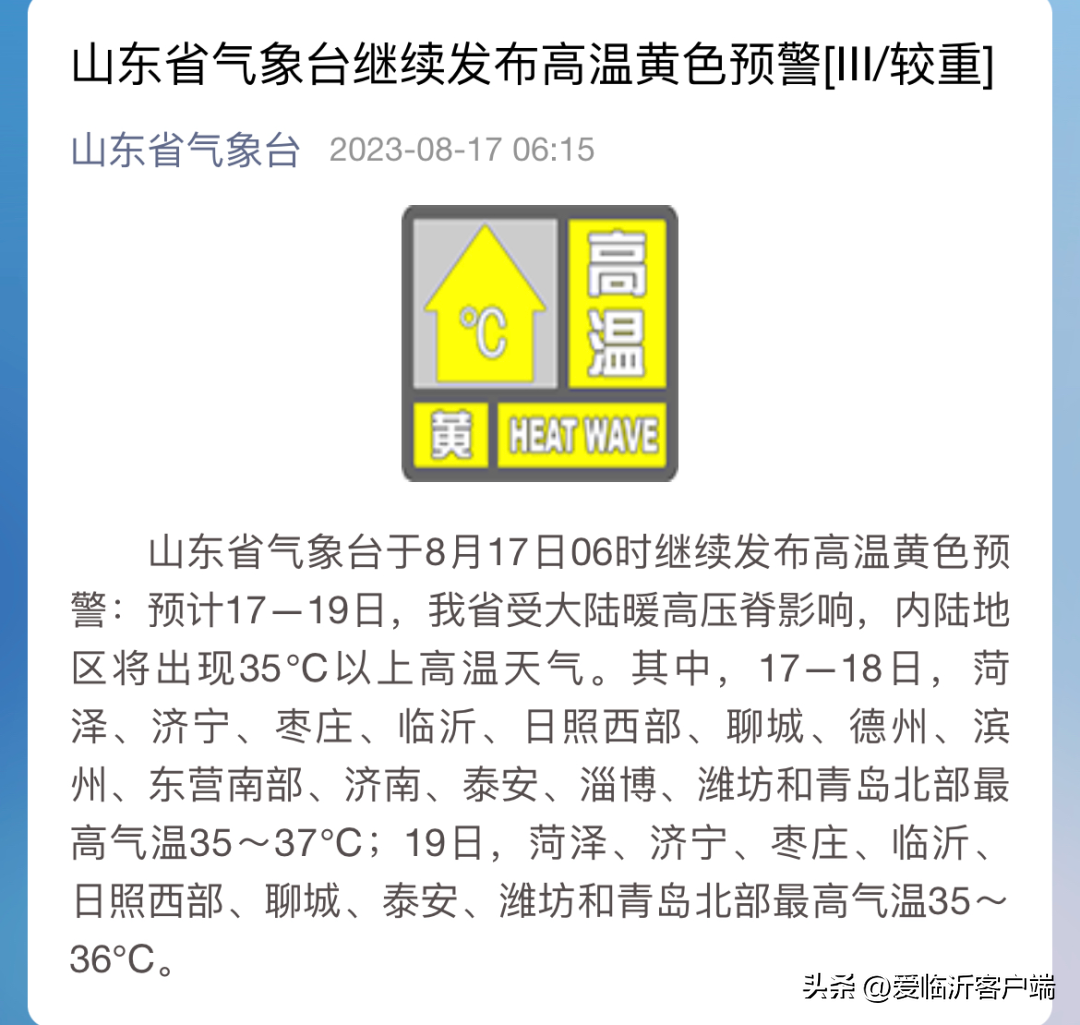 導讀立秋已過接下來的日子會越來越涼快嗎?最新消息!山東省氣象臺于8月17日6時繼續發布高溫黃色預警天又熱起來了!↓↓↓預計8月17日-19日,山東省受大陸暖高壓脊影響,內陸地區將出現35℃以上高溫天氣。其