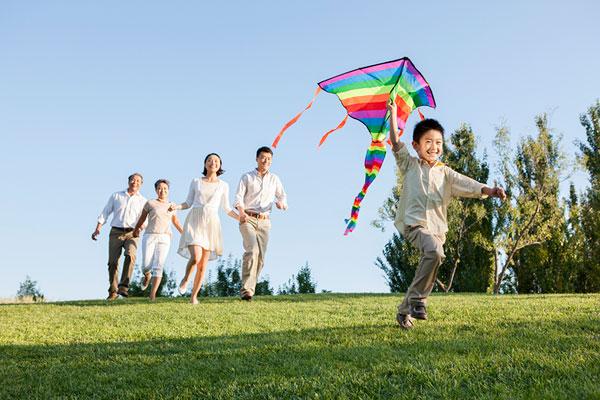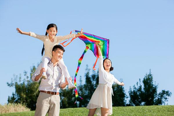 遠處,小明一家也在草坪上放風箏,小明拉著線在快速地奔跑,媽媽高高地舉著風箏,爸爸負責當指揮,望著剛剛飛上藍天的風箏,看著越飛越高的風箏,一家人開心地笑了。